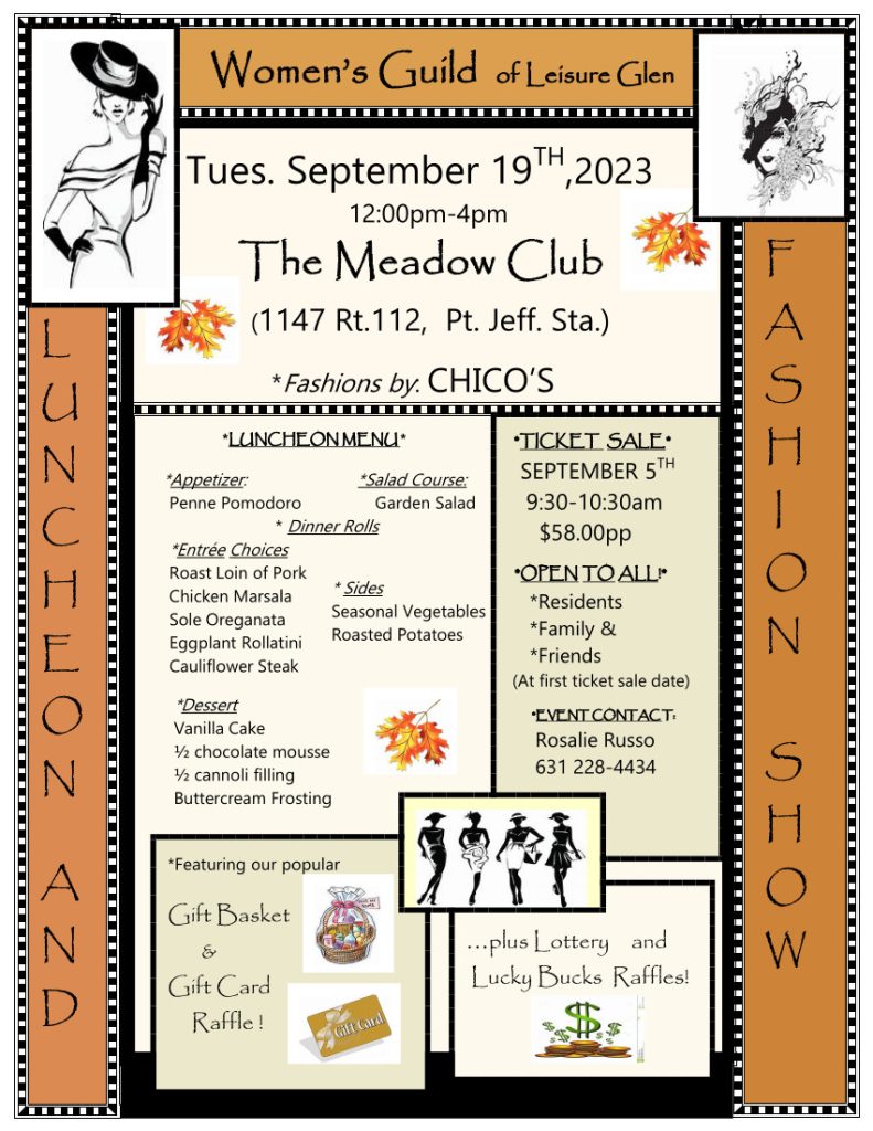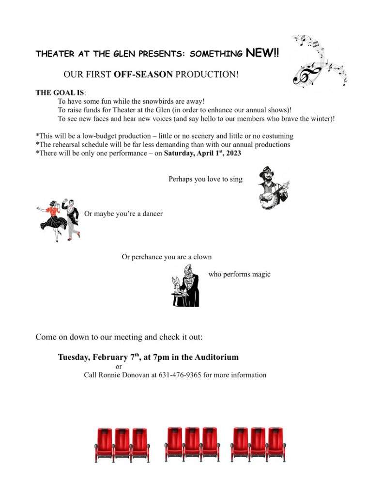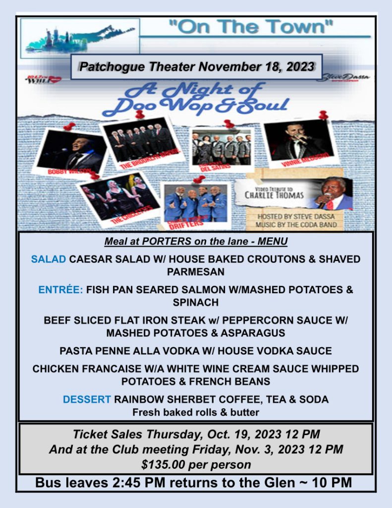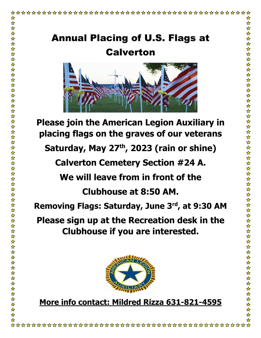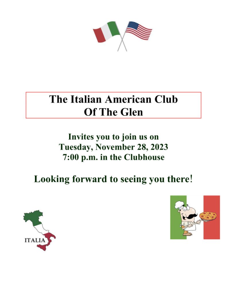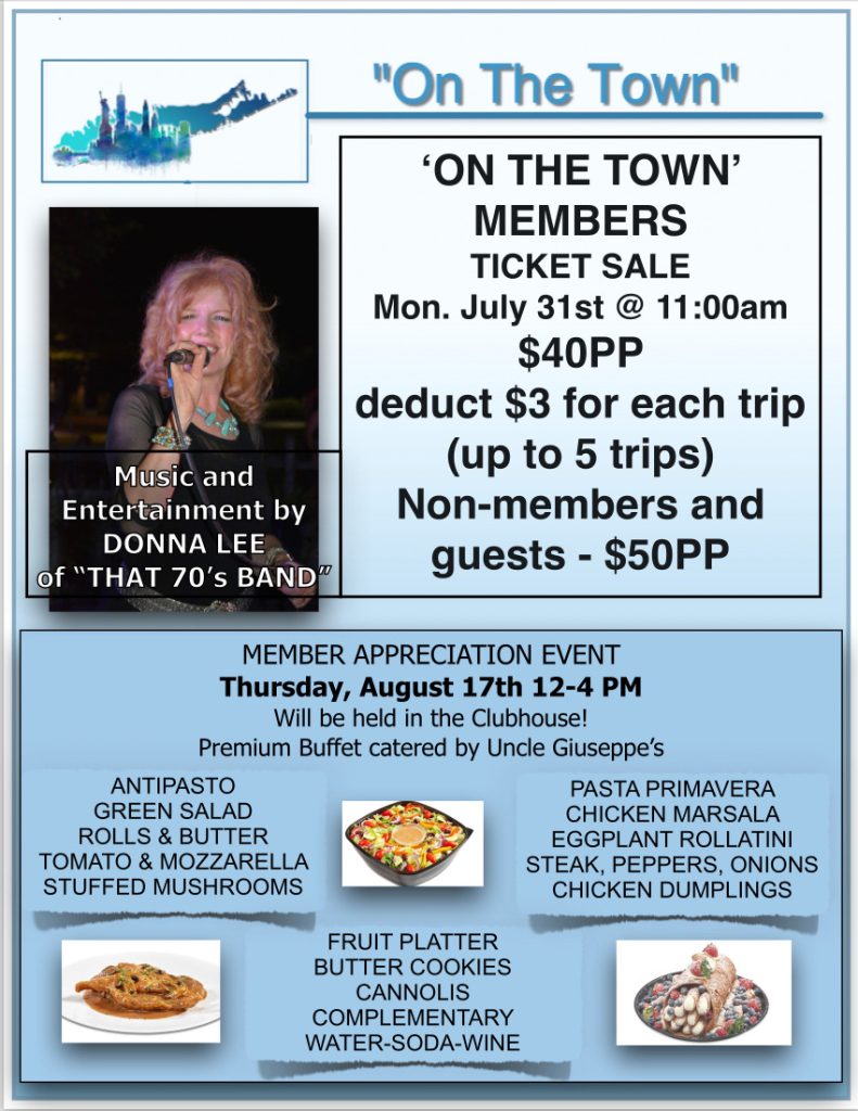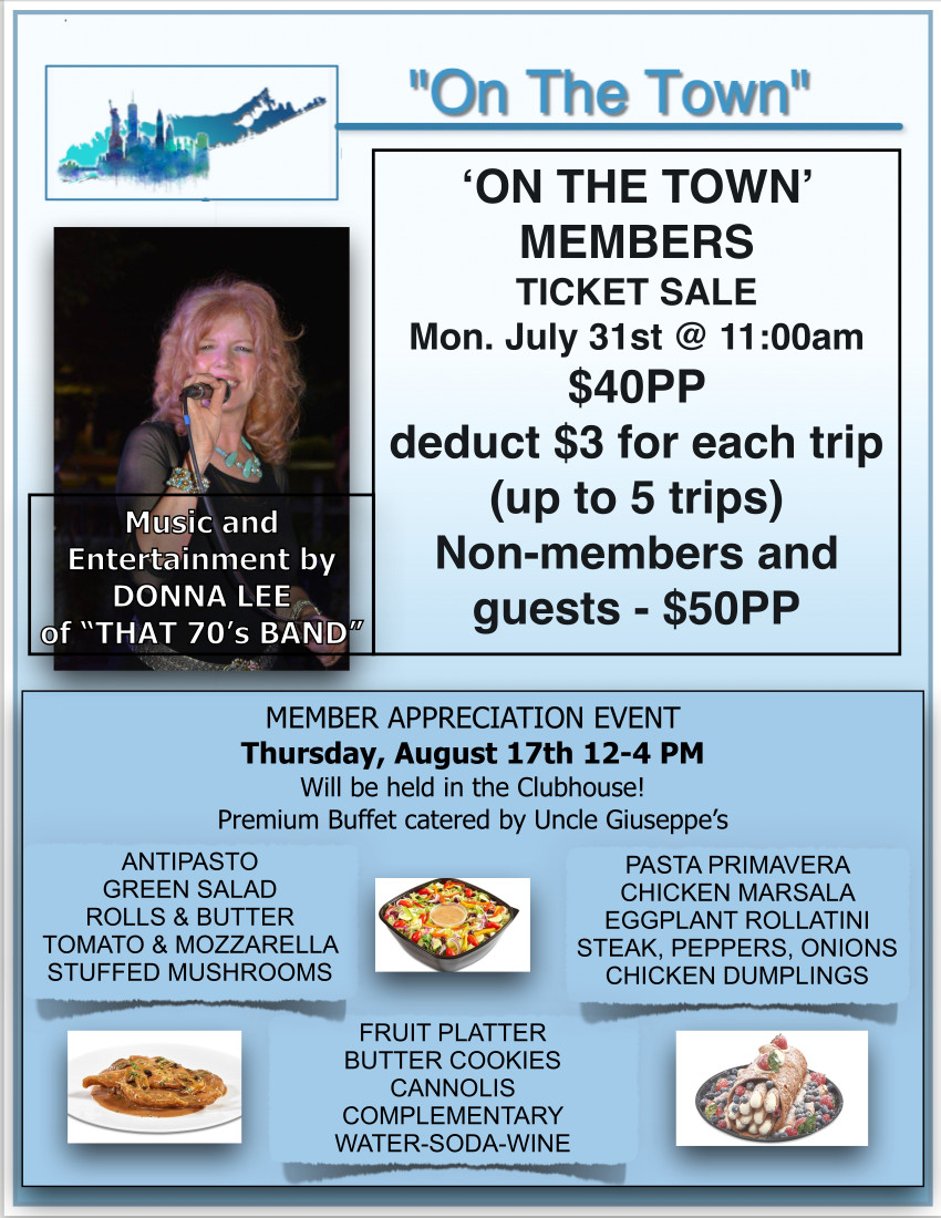 2023 Event Flyers 2024 Event Flyers New Year's Eve Party 12/31 Garden Club Holiday Project 12/4 Women's Guild Wrap Day 12/12 Annual Hanukkah Celebration 12/11 Trim-A-Tree 12/05 Casino Trip 11/29 Computer Club 11/21 Date Changed Holiday Concert 11/19 OTT Doo-Wop Show 11/18 Garden Club Meeting 11/16 Social Club Meeting & Elections 11/16 Glen Cafe Meeting/Elections 11/15 W.G. Game Day 11/14 Night at the Races 11/11 Veterans's Day Ceremony 11/11 Members Only Breakfast 11/09 Italian American Club 11/08 Theater Club 11/08 Defensive Driving 11/08 W.G. Food Drive 11/02 Halloween Party 10/28 Flu Shots Available 10/18 Pizza Game Day 10/17 Garden Club 10/12 Lucille Ball Talk 10/11 Travel Club to Cape Cod 10/9 Columbus Day Dinner/Dance 10/07 Theater Club Meeting 10/03 Theater "Finally Famous" 9/28-10/01 Food Truck Returns! 9/28 On The Town 9/21 Relax by the Pool Starting 9/18 W.G. Fashion Show 9/19 I/A Open Mic Nite 9/16 Open Resident Mtg 9/14 Mister Softee Returns! 9/13 Italian/American Club 9/12 Pottery Starts 9/11 Arts & Crafts Show 9/10 Garden Club 9/07 Italian/American Concert 9/01 Food Truck 8/31 Mister Softee 8/30 Bingo Election Meeting 8/28 Russo Dinner Dance 8/26 Weds. Ladies Bocce starts 8/23 OTT Member Appreciation 8/17 W.G. Game Day 8/15 Night at the Races 8/12 Pool Party 8/04 Men's Bocce & Horseshoes 8/03 Theater Club 8/01 Music by the Pool 7/28 Italian American Club 7/20 On The Town 7/19 Garden Club Lunch 7/13 Theater Club 7/05 On The Town Cruise 6/24 Movie by the Pool 6/23 Meet the Board 6/22 Ice Cream Game Day 6/20 Travel Club Belmont Trip 6/15 Italian/American Club 6/13 Computer Club 6/13 Garden Club Plant Sale 6/08 2023 B.O.D. election notice 6/07 Theater Club 6/06 Art Show 6/04 Pasta Night 6/02 Strawberry Festival 6/01 Memorial Day Celebration 5/30 Game Show Night 5/27 Calverton Flag Placing 5/27 (removing flags 6/03) Heart Attack Care 5/26 Life Plan Seminar 5/23 On The Town Trip 5/19 Game Day 5/16 Tennis/Pickleball Mtg 5/13 Garden Club 5/11 Lawn Treatments 5/2 & 5/3 Women's Guild Luncheon 4/18 On The Town Trip 4/16 Night at the Races 4/15 Garden Club 4/13 Arthritis Seminar 4/12 Theater Production 4/01 Defensive Driving 3/29 Afternoon Movie 3/24 Game Day 3/21 St. Patrick's Day Party 3/18 Optimum Renewal Meeting 3/16 Computer Club 3/14 Quilting Demo 3/09 Theater Club 3/07 Afternoon Movie 2/24 Wind Creek Casino 2/23 Game Day 2/21 Social Club Pajama Party 2/19 Computer Club 2/14 Theater Club 2/7 Auditorium Closed 1/21 - 2/3 Computer Club 1/10 2022 Flyers