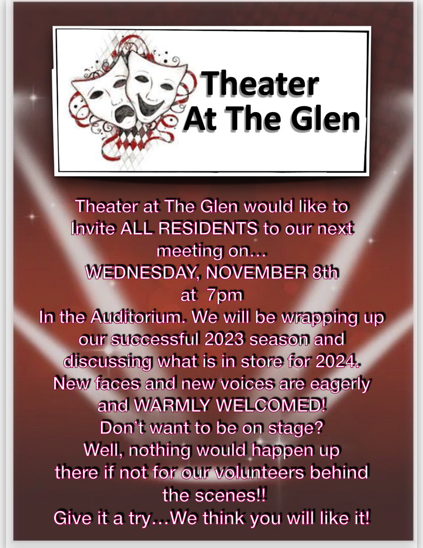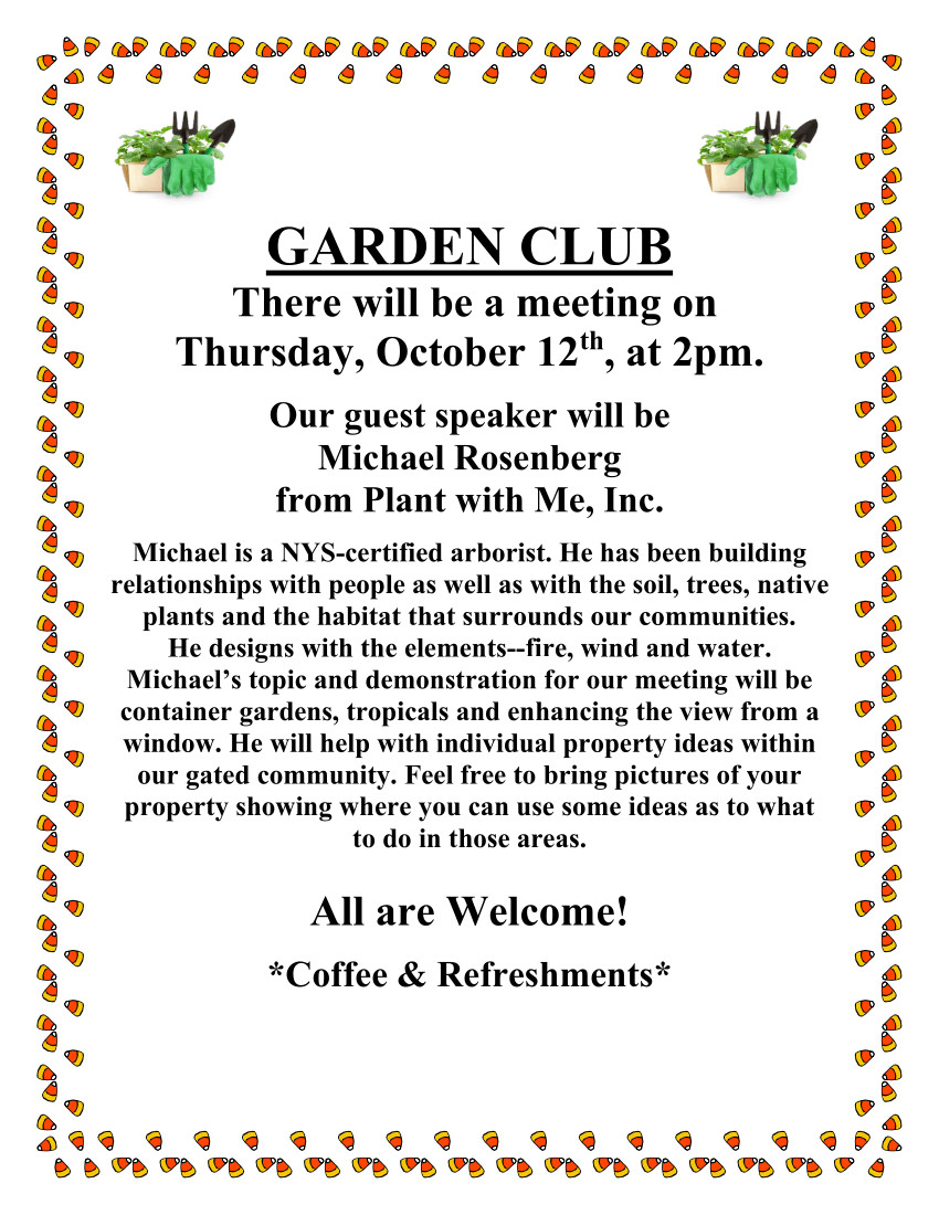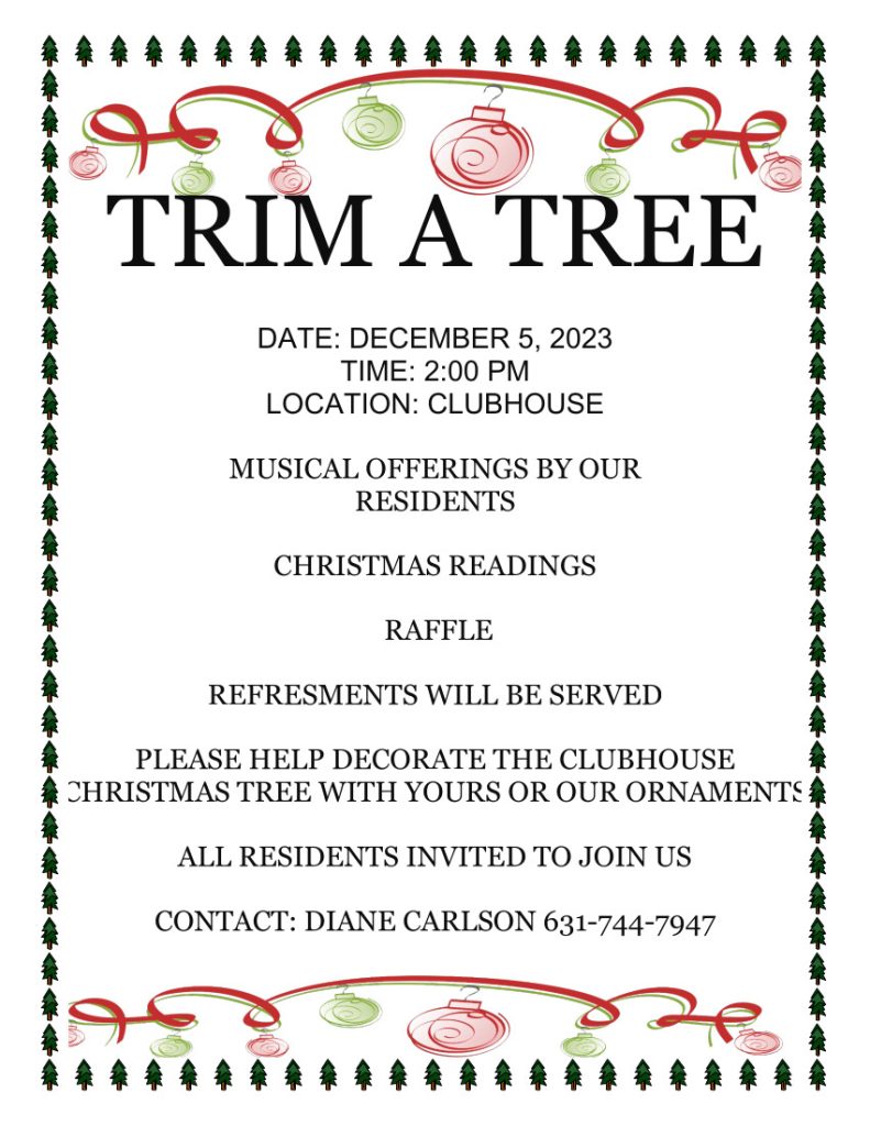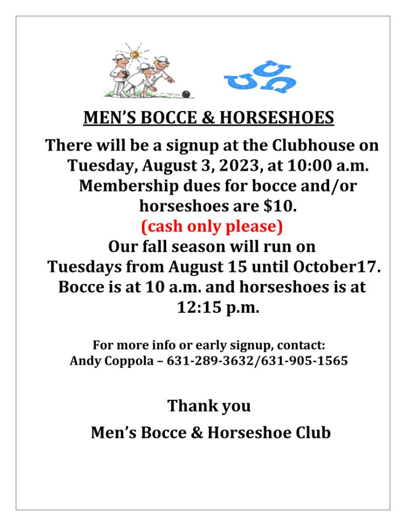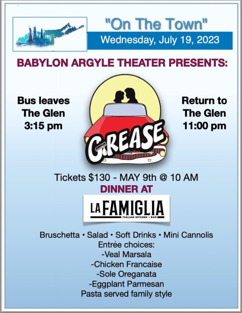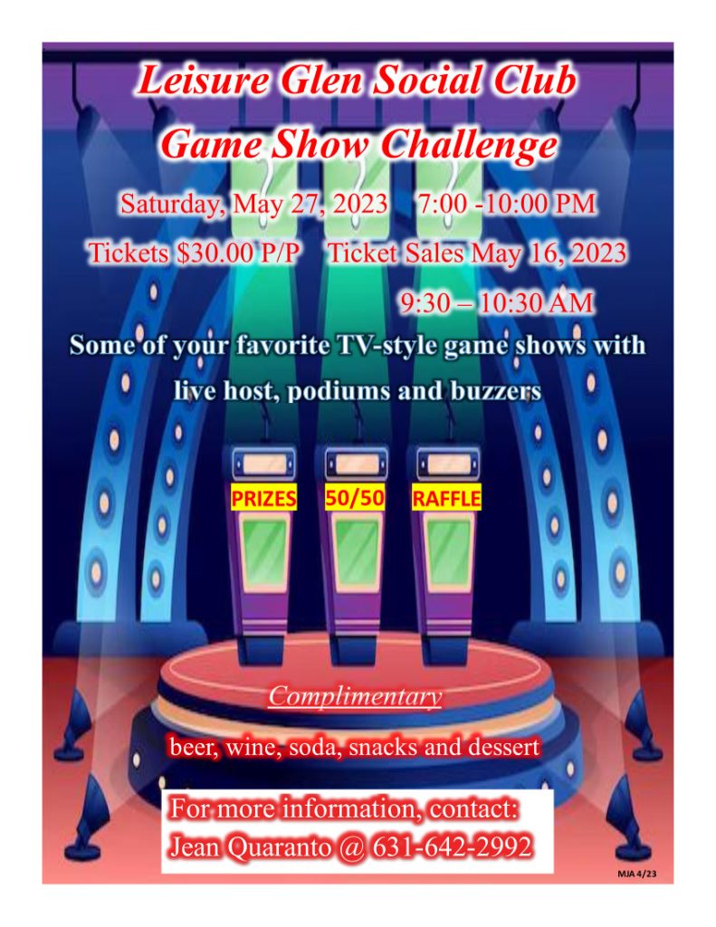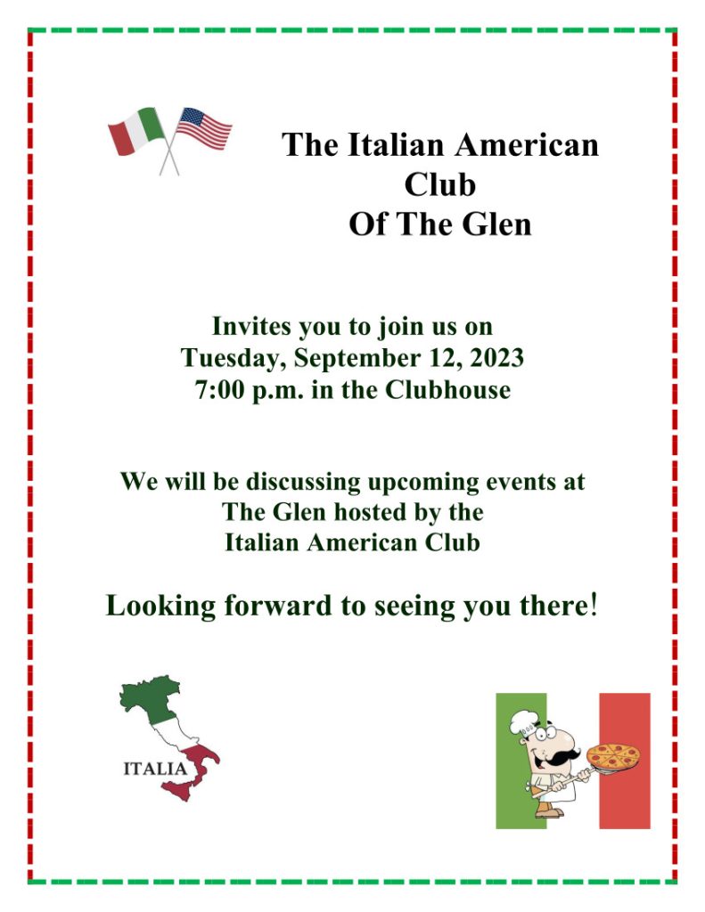 2023 Event Flyers 2024 Event Flyers New Year's Eve Party 12/31 Garden Club Holiday Project 12/4 Women's Guild Wrap Day 12/12 Annual Hanukkah Celebration 12/11 Trim-A-Tree 12/05 Casino Trip 11/29 Computer Club 11/21 Date Changed Holiday Concert 11/19 OTT Doo-Wop Show 11/18 Garden Club Meeting 11/16 Social Club Meeting & Elections 11/16 Glen Cafe Meeting/Elections 11/15 W.G. Game Day 11/14 Night at the Races 11/11 Veterans's Day Ceremony 11/11 Members Only Breakfast 11/09 Italian American Club 11/08 Theater Club 11/08 Defensive Driving 11/08 W.G. Food Drive 11/02 Halloween Party 10/28 Flu Shots Available 10/18 Pizza Game Day 10/17 Garden Club 10/12 Lucille Ball Talk 10/11 Travel Club to Cape Cod 10/9 Columbus Day Dinner/Dance 10/07 Theater Club Meeting 10/03 Theater "Finally Famous" 9/28-10/01 Food Truck Returns! 9/28 On The Town 9/21 Relax by the Pool Starting 9/18 W.G. Fashion Show 9/19 I/A Open Mic Nite 9/16 Open Resident Mtg 9/14 Mister Softee Returns! 9/13 Italian/American Club 9/12 Pottery Starts 9/11 Arts & Crafts Show 9/10 Garden Club 9/07 Italian/American Concert 9/01 Food Truck 8/31 Mister Softee 8/30 Bingo Election Meeting 8/28 Russo Dinner Dance 8/26 Weds. Ladies Bocce starts 8/23 OTT Member Appreciation 8/17 W.G. Game Day 8/15 Night at the Races 8/12 Pool Party 8/04 Men's Bocce & Horseshoes 8/03 Theater Club 8/01 Music by the Pool 7/28 Italian American Club 7/20 On The Town 7/19 Garden Club Lunch 7/13 Theater Club 7/05 On The Town Cruise 6/24 Movie by the Pool 6/23 Meet the Board 6/22 Ice Cream Game Day 6/20 Travel Club Belmont Trip 6/15 Italian/American Club 6/13 Computer Club 6/13 Garden Club Plant Sale 6/08 2023 B.O.D. election notice 6/07 Theater Club 6/06 Art Show 6/04 Pasta Night 6/02 Strawberry Festival 6/01 Memorial Day Celebration 5/30 Game Show Night 5/27 Calverton Flag Placing 5/27 (removing flags 6/03) Heart Attack Care 5/26 Life Plan Seminar 5/23 On The Town Trip 5/19 Game Day 5/16 Tennis/Pickleball Mtg 5/13 Garden Club 5/11 Lawn Treatments 5/2 & 5/3 Women's Guild Luncheon 4/18 On The Town Trip 4/16 Night at the Races 4/15 Garden Club 4/13 Arthritis Seminar 4/12 Theater Production 4/01 Defensive Driving 3/29 Afternoon Movie 3/24 Game Day 3/21 St. Patrick's Day Party 3/18 Optimum Renewal Meeting 3/16 Computer Club 3/14 Quilting Demo 3/09 Theater Club 3/07 Afternoon Movie 2/24 Wind Creek Casino 2/23 Game Day 2/21 Social Club Pajama Party 2/19 Computer Club 2/14 Theater Club 2/7 Auditorium Closed 1/21 - 2/3 Computer Club 1/10 2022 Flyers