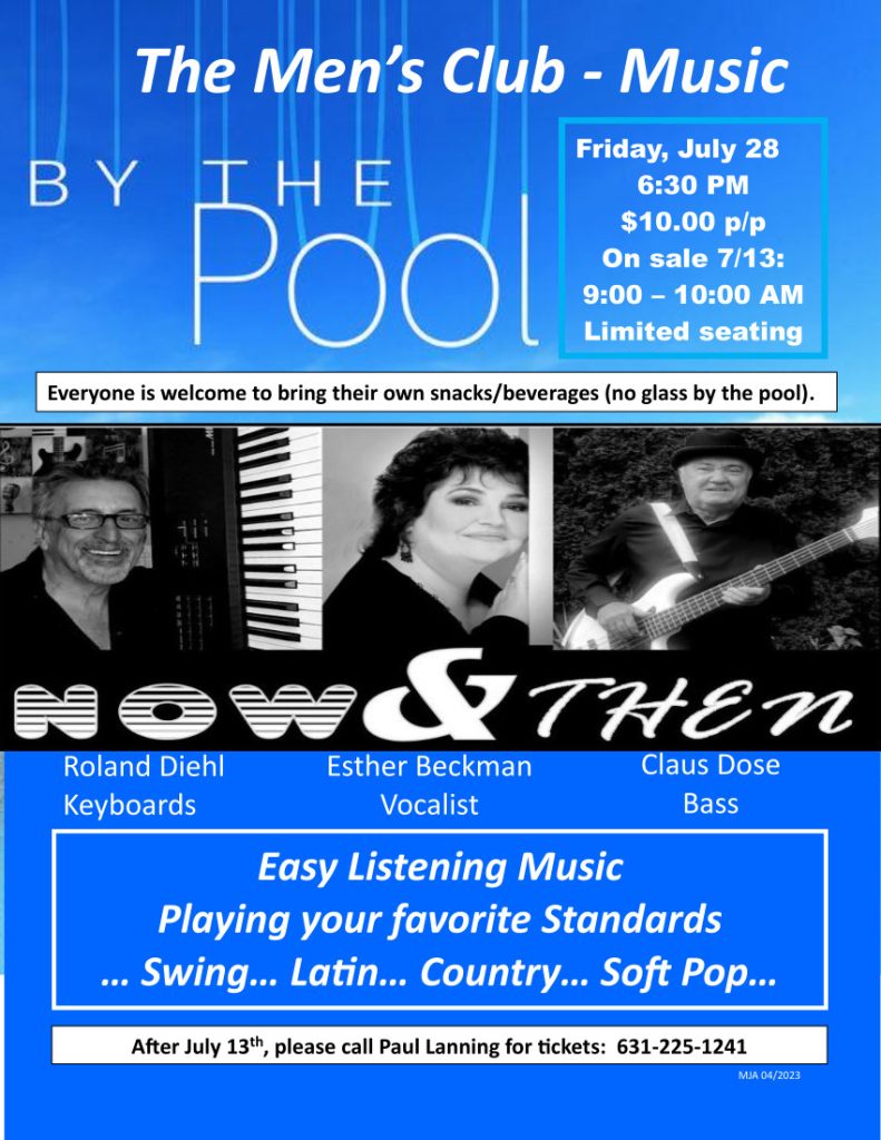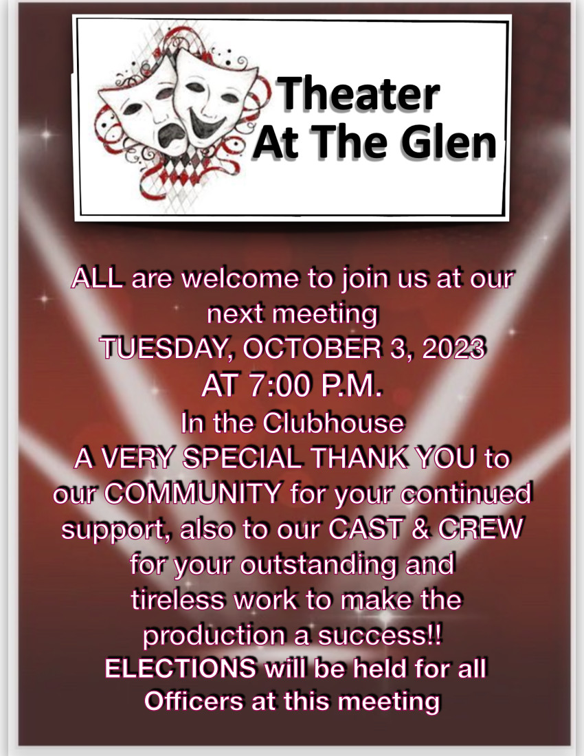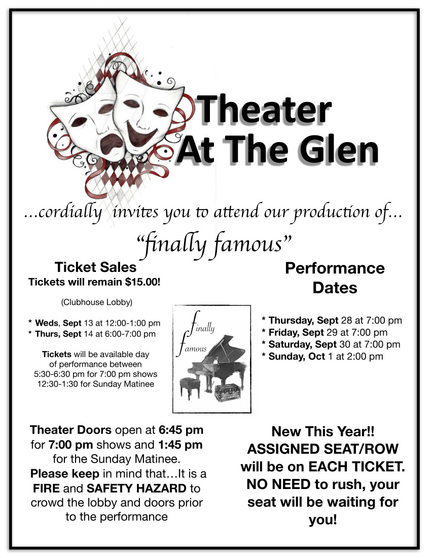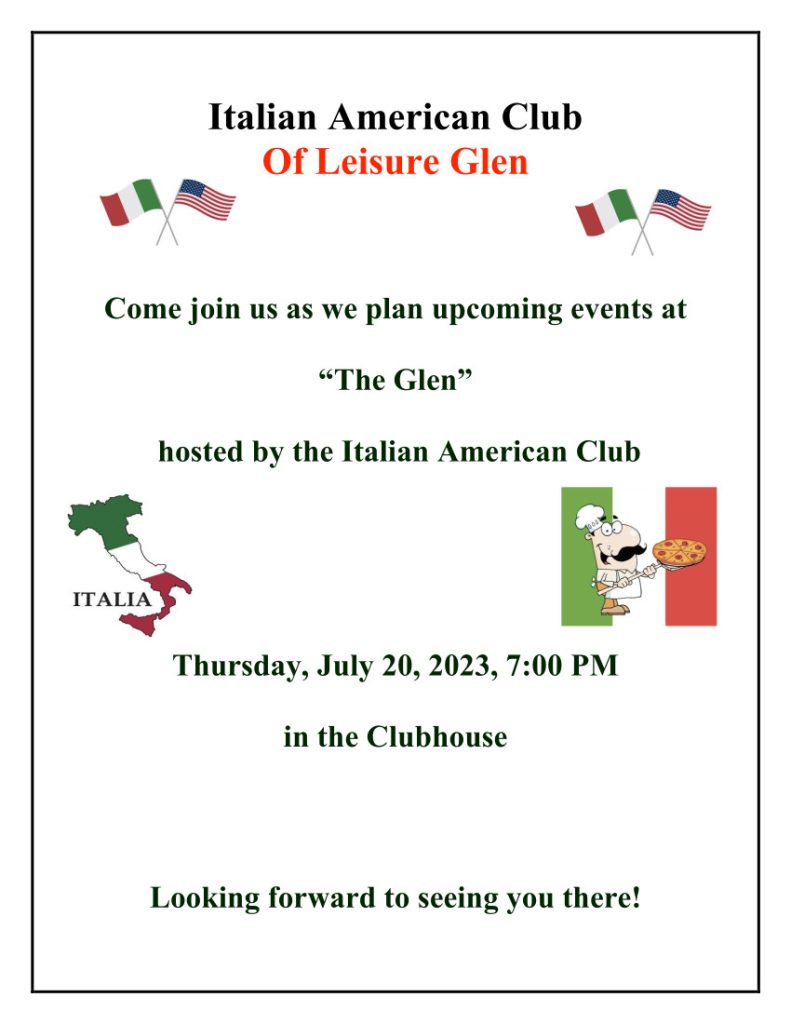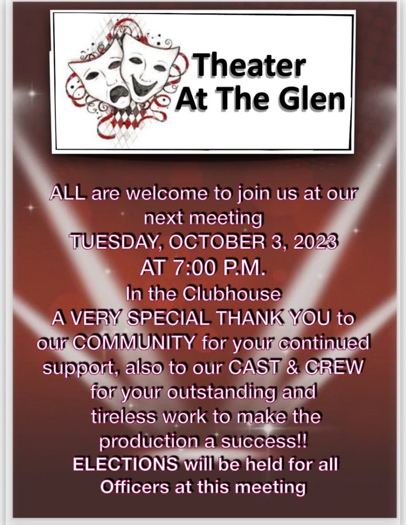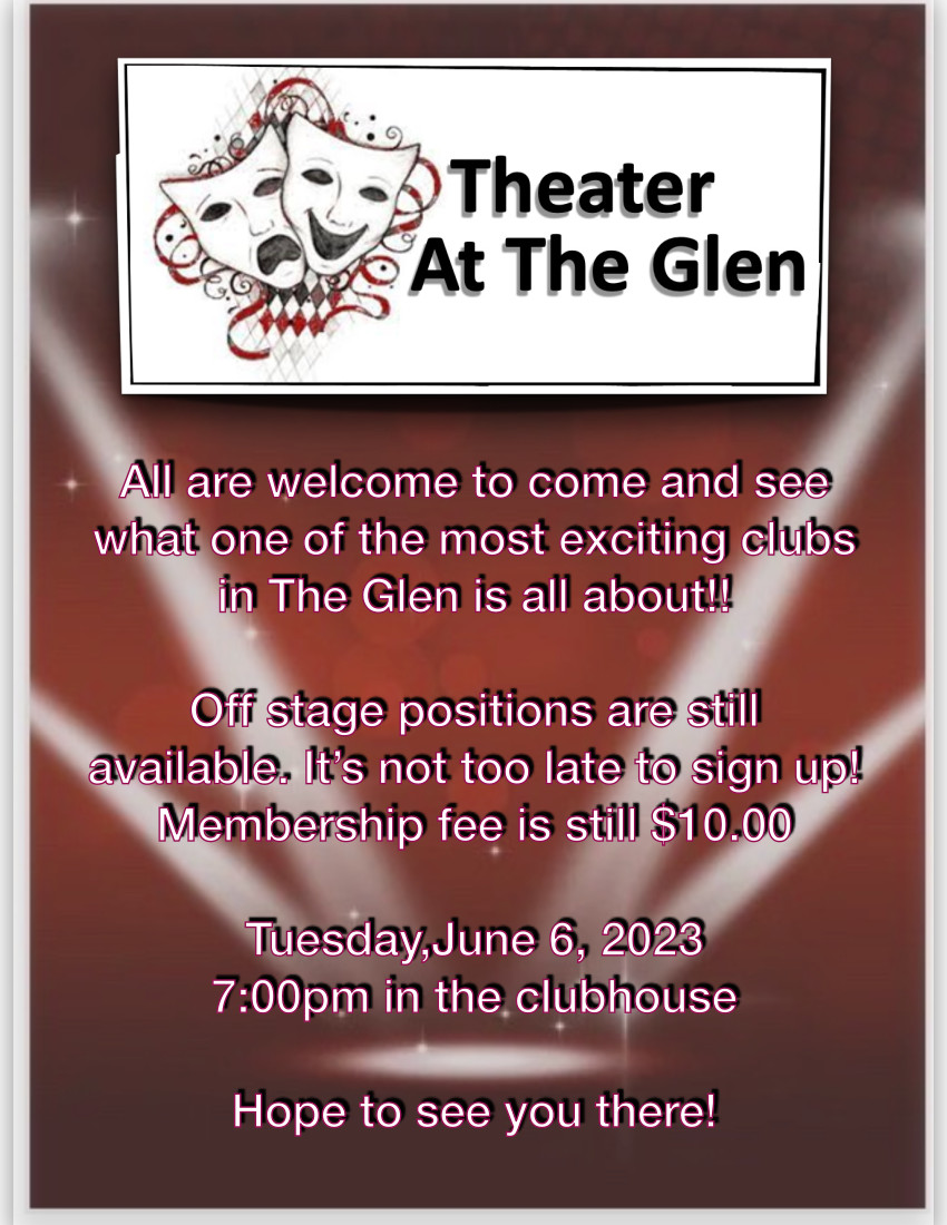 2023 Event Flyers 2024 Event Flyers New Year's Eve Party 12/31 Garden Club Holiday Project 12/4 Women's Guild Wrap Day 12/12 Annual Hanukkah Celebration 12/11 Trim-A-Tree 12/05 Casino Trip 11/29 Computer Club 11/21 Date Changed Holiday Concert 11/19 OTT Doo-Wop Show 11/18 Garden Club Meeting 11/16 Social Club Meeting & Elections 11/16 Glen Cafe Meeting/Elections 11/15 W.G. Game Day 11/14 Night at the Races 11/11 Veterans's Day Ceremony 11/11 Members Only Breakfast 11/09 Italian American Club 11/08 Theater Club 11/08 Defensive Driving 11/08 W.G. Food Drive 11/02 Halloween Party 10/28 Flu Shots Available 10/18 Pizza Game Day 10/17 Garden Club 10/12 Lucille Ball Talk 10/11 Travel Club to Cape Cod 10/9 Columbus Day Dinner/Dance 10/07 Theater Club Meeting 10/03 Theater "Finally Famous" 9/28-10/01 Food Truck Returns! 9/28 On The Town 9/21 Relax by the Pool Starting 9/18 W.G. Fashion Show 9/19 I/A Open Mic Nite 9/16 Open Resident Mtg 9/14 Mister Softee Returns! 9/13 Italian/American Club 9/12 Pottery Starts 9/11 Arts & Crafts Show 9/10 Garden Club 9/07 Italian/American Concert 9/01 Food Truck 8/31 Mister Softee 8/30 Bingo Election Meeting 8/28 Russo Dinner Dance 8/26 Weds. Ladies Bocce starts 8/23 OTT Member Appreciation 8/17 W.G. Game Day 8/15 Night at the Races 8/12 Pool Party 8/04 Men's Bocce & Horseshoes 8/03 Theater Club 8/01 Music by the Pool 7/28 Italian American Club 7/20 On The Town 7/19 Garden Club Lunch 7/13 Theater Club 7/05 On The Town Cruise 6/24 Movie by the Pool 6/23 Meet the Board 6/22 Ice Cream Game Day 6/20 Travel Club Belmont Trip 6/15 Italian/American Club 6/13 Computer Club 6/13 Garden Club Plant Sale 6/08 2023 B.O.D. election notice 6/07 Theater Club 6/06 Art Show 6/04 Pasta Night 6/02 Strawberry Festival 6/01 Memorial Day Celebration 5/30 Game Show Night 5/27 Calverton Flag Placing 5/27 (removing flags 6/03) Heart Attack Care 5/26 Life Plan Seminar 5/23 On The Town Trip 5/19 Game Day 5/16 Tennis/Pickleball Mtg 5/13 Garden Club 5/11 Lawn Treatments 5/2 & 5/3 Women's Guild Luncheon 4/18 On The Town Trip 4/16 Night at the Races 4/15 Garden Club 4/13 Arthritis Seminar 4/12 Theater Production 4/01 Defensive Driving 3/29 Afternoon Movie 3/24 Game Day 3/21 St. Patrick's Day Party 3/18 Optimum Renewal Meeting 3/16 Computer Club 3/14 Quilting Demo 3/09 Theater Club 3/07 Afternoon Movie 2/24 Wind Creek Casino 2/23 Game Day 2/21 Social Club Pajama Party 2/19 Computer Club 2/14 Theater Club 2/7 Auditorium Closed 1/21 - 2/3 Computer Club 1/10 2022 Flyers