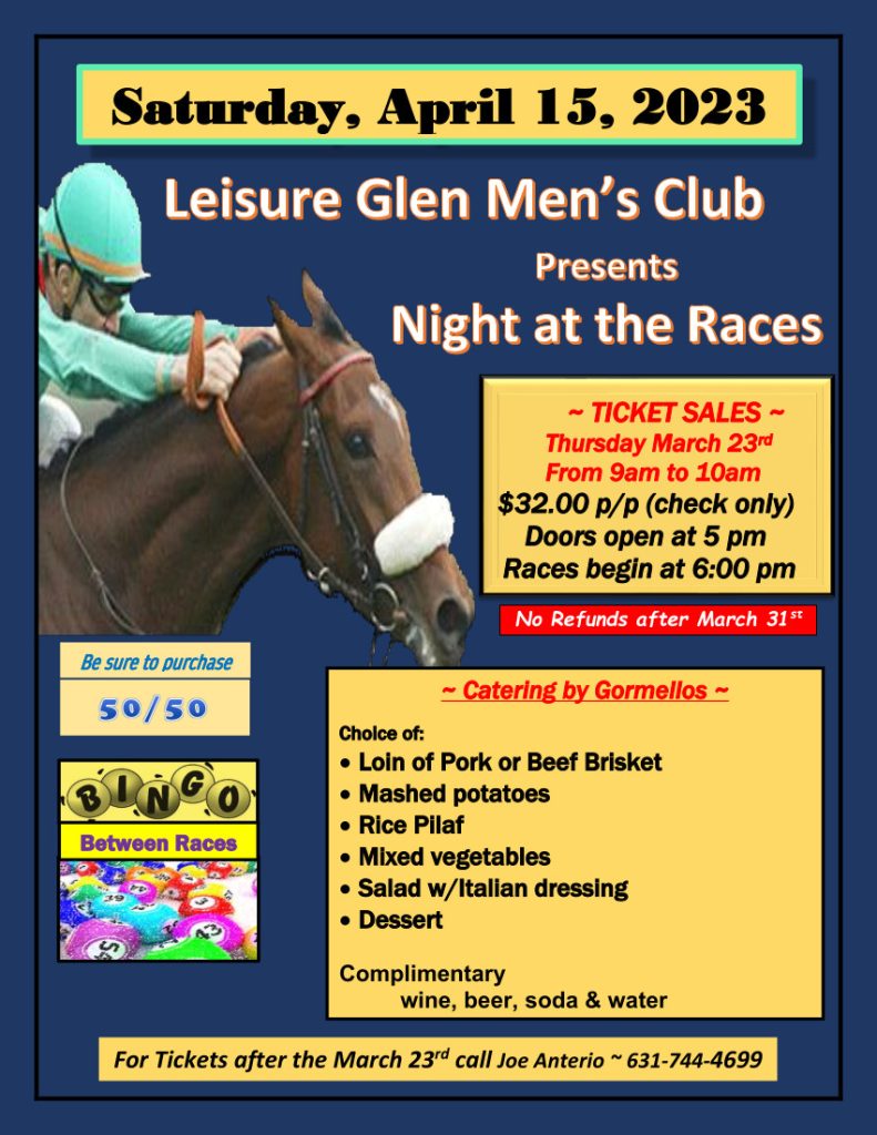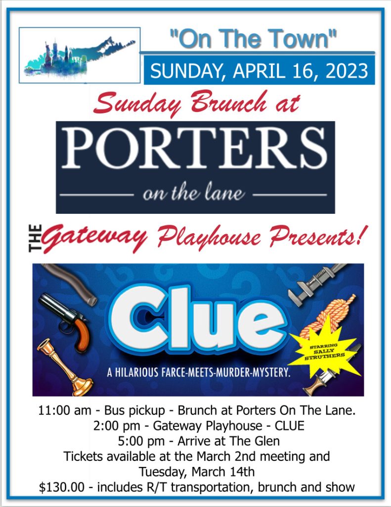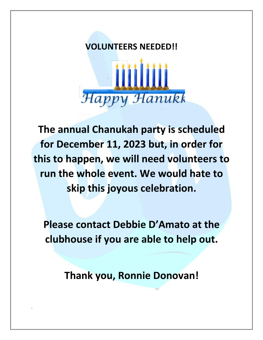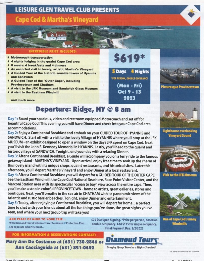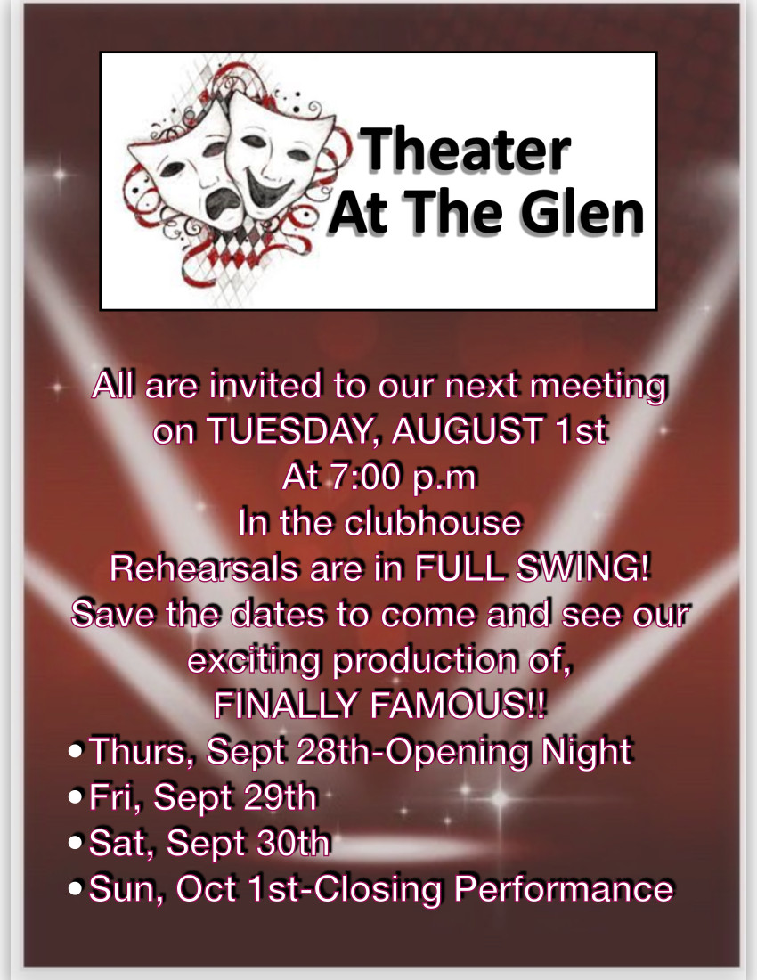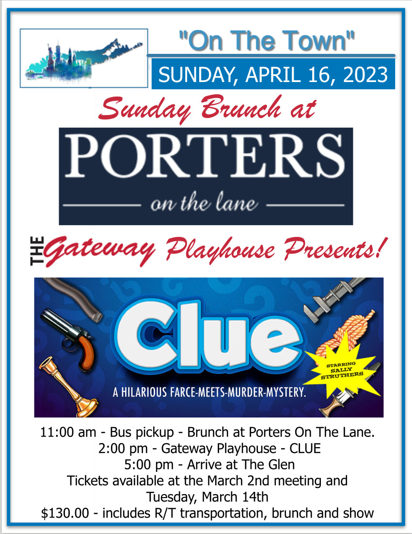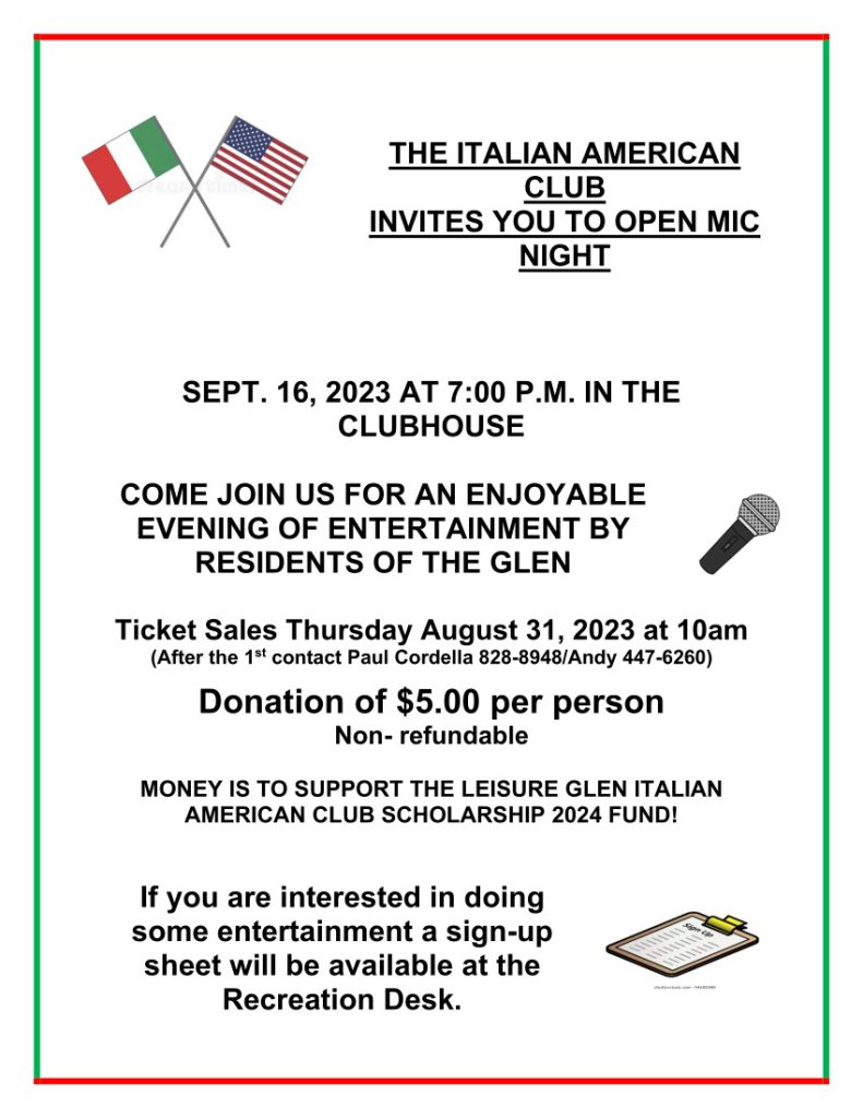 2023 Event Flyers 2024 Event Flyers New Year's Eve Party 12/31 Garden Club Holiday Project 12/4 Women's Guild Wrap Day 12/12 Annual Hanukkah Celebration 12/11 Trim-A-Tree 12/05 Casino Trip 11/29 Computer Club 11/21 Date Changed Holiday Concert 11/19 OTT Doo-Wop Show 11/18 Garden Club Meeting 11/16 Social Club Meeting & Elections 11/16 Glen Cafe Meeting/Elections 11/15 W.G. Game Day 11/14 Night at the Races 11/11 Veterans's Day Ceremony 11/11 Members Only Breakfast 11/09 Italian American Club 11/08 Theater Club 11/08 Defensive Driving 11/08 W.G. Food Drive 11/02 Halloween Party 10/28 Flu Shots Available 10/18 Pizza Game Day 10/17 Garden Club 10/12 Lucille Ball Talk 10/11 Travel Club to Cape Cod 10/9 Columbus Day Dinner/Dance 10/07 Theater Club Meeting 10/03 Theater "Finally Famous" 9/28-10/01 Food Truck Returns! 9/28 On The Town 9/21 Relax by the Pool Starting 9/18 W.G. Fashion Show 9/19 I/A Open Mic Nite 9/16 Open Resident Mtg 9/14 Mister Softee Returns! 9/13 Italian/American Club 9/12 Pottery Starts 9/11 Arts & Crafts Show 9/10 Garden Club 9/07 Italian/American Concert 9/01 Food Truck 8/31 Mister Softee 8/30 Bingo Election Meeting 8/28 Russo Dinner Dance 8/26 Weds. Ladies Bocce starts 8/23 OTT Member Appreciation 8/17 W.G. Game Day 8/15 Night at the Races 8/12 Pool Party 8/04 Men's Bocce & Horseshoes 8/03 Theater Club 8/01 Music by the Pool 7/28 Italian American Club 7/20 On The Town 7/19 Garden Club Lunch 7/13 Theater Club 7/05 On The Town Cruise 6/24 Movie by the Pool 6/23 Meet the Board 6/22 Ice Cream Game Day 6/20 Travel Club Belmont Trip 6/15 Italian/American Club 6/13 Computer Club 6/13 Garden Club Plant Sale 6/08 2023 B.O.D. election notice 6/07 Theater Club 6/06 Art Show 6/04 Pasta Night 6/02 Strawberry Festival 6/01 Memorial Day Celebration 5/30 Game Show Night 5/27 Calverton Flag Placing 5/27 (removing flags 6/03) Heart Attack Care 5/26 Life Plan Seminar 5/23 On The Town Trip 5/19 Game Day 5/16 Tennis/Pickleball Mtg 5/13 Garden Club 5/11 Lawn Treatments 5/2 & 5/3 Women's Guild Luncheon 4/18 On The Town Trip 4/16 Night at the Races 4/15 Garden Club 4/13 Arthritis Seminar 4/12 Theater Production 4/01 Defensive Driving 3/29 Afternoon Movie 3/24 Game Day 3/21 St. Patrick's Day Party 3/18 Optimum Renewal Meeting 3/16 Computer Club 3/14 Quilting Demo 3/09 Theater Club 3/07 Afternoon Movie 2/24 Wind Creek Casino 2/23 Game Day 2/21 Social Club Pajama Party 2/19 Computer Club 2/14 Theater Club 2/7 Auditorium Closed 1/21 - 2/3 Computer Club 1/10 2022 Flyers
