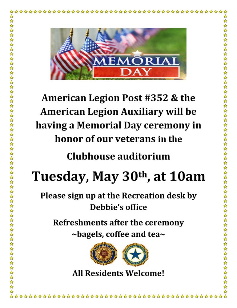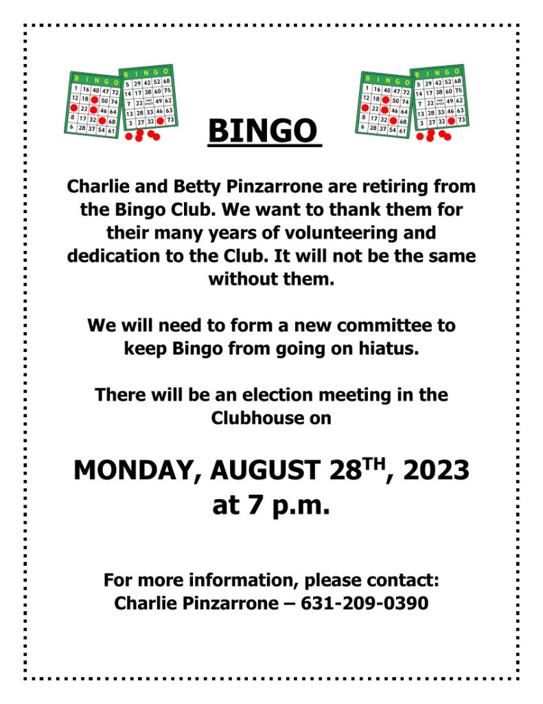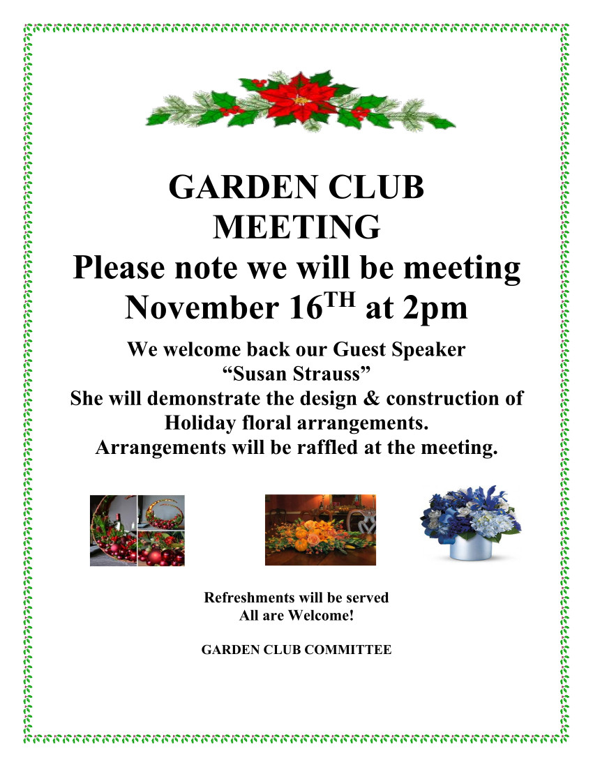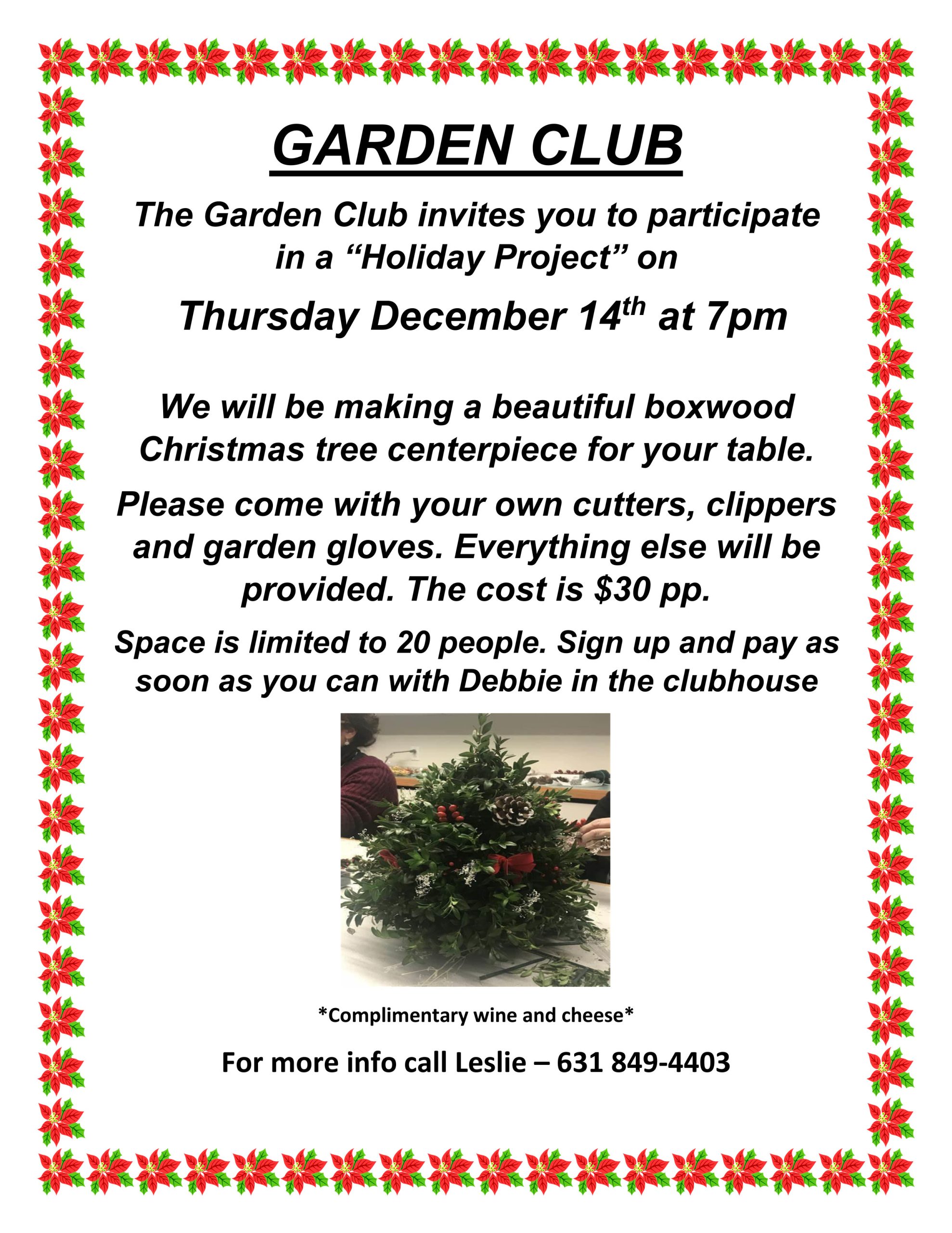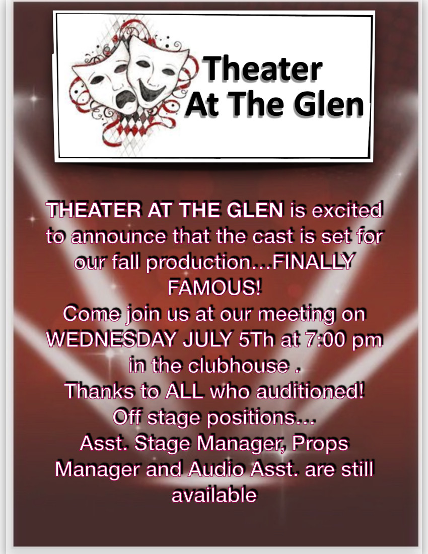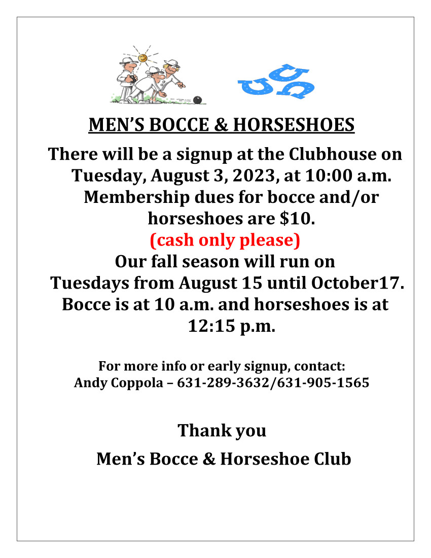 2023 Event Flyers 2024 Event Flyers New Year's Eve Party 12/31 Garden Club Holiday Project 12/4 Women's Guild Wrap Day 12/12 Annual Hanukkah Celebration 12/11 Trim-A-Tree 12/05 Casino Trip 11/29 Computer Club 11/21 Date Changed Holiday Concert 11/19 OTT Doo-Wop Show 11/18 Garden Club Meeting 11/16 Social Club Meeting & Elections 11/16 Glen Cafe Meeting/Elections 11/15 W.G. Game Day 11/14 Night at the Races 11/11 Veterans's Day Ceremony 11/11 Members Only Breakfast 11/09 Italian American Club 11/08 Theater Club 11/08 Defensive Driving 11/08 W.G. Food Drive 11/02 Halloween Party 10/28 Flu Shots Available 10/18 Pizza Game Day 10/17 Garden Club 10/12 Lucille Ball Talk 10/11 Travel Club to Cape Cod 10/9 Columbus Day Dinner/Dance 10/07 Theater Club Meeting 10/03 Theater "Finally Famous" 9/28-10/01 Food Truck Returns! 9/28 On The Town 9/21 Relax by the Pool Starting 9/18 W.G. Fashion Show 9/19 I/A Open Mic Nite 9/16 Open Resident Mtg 9/14 Mister Softee Returns! 9/13 Italian/American Club 9/12 Pottery Starts 9/11 Arts & Crafts Show 9/10 Garden Club 9/07 Italian/American Concert 9/01 Food Truck 8/31 Mister Softee 8/30 Bingo Election Meeting 8/28 Russo Dinner Dance 8/26 Weds. Ladies Bocce starts 8/23 OTT Member Appreciation 8/17 W.G. Game Day 8/15 Night at the Races 8/12 Pool Party 8/04 Men's Bocce & Horseshoes 8/03 Theater Club 8/01 Music by the Pool 7/28 Italian American Club 7/20 On The Town 7/19 Garden Club Lunch 7/13 Theater Club 7/05 On The Town Cruise 6/24 Movie by the Pool 6/23 Meet the Board 6/22 Ice Cream Game Day 6/20 Travel Club Belmont Trip 6/15 Italian/American Club 6/13 Computer Club 6/13 Garden Club Plant Sale 6/08 2023 B.O.D. election notice 6/07 Theater Club 6/06 Art Show 6/04 Pasta Night 6/02 Strawberry Festival 6/01 Memorial Day Celebration 5/30 Game Show Night 5/27 Calverton Flag Placing 5/27 (removing flags 6/03) Heart Attack Care 5/26 Life Plan Seminar 5/23 On The Town Trip 5/19 Game Day 5/16 Tennis/Pickleball Mtg 5/13 Garden Club 5/11 Lawn Treatments 5/2 & 5/3 Women's Guild Luncheon 4/18 On The Town Trip 4/16 Night at the Races 4/15 Garden Club 4/13 Arthritis Seminar 4/12 Theater Production 4/01 Defensive Driving 3/29 Afternoon Movie 3/24 Game Day 3/21 St. Patrick's Day Party 3/18 Optimum Renewal Meeting 3/16 Computer Club 3/14 Quilting Demo 3/09 Theater Club 3/07 Afternoon Movie 2/24 Wind Creek Casino 2/23 Game Day 2/21 Social Club Pajama Party 2/19 Computer Club 2/14 Theater Club 2/7 Auditorium Closed 1/21 - 2/3 Computer Club 1/10 2022 Flyers