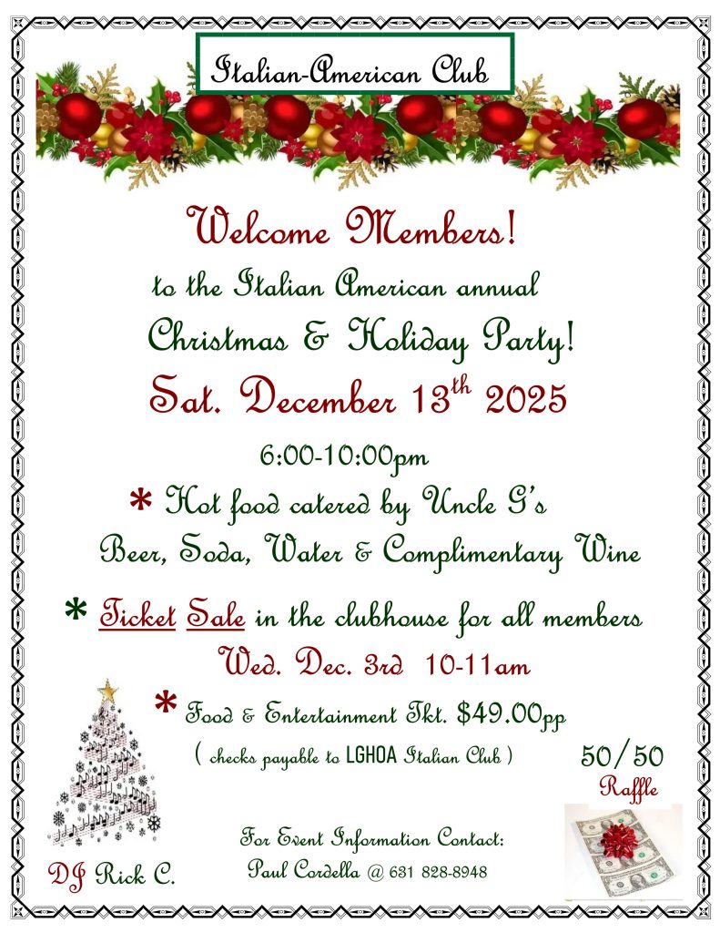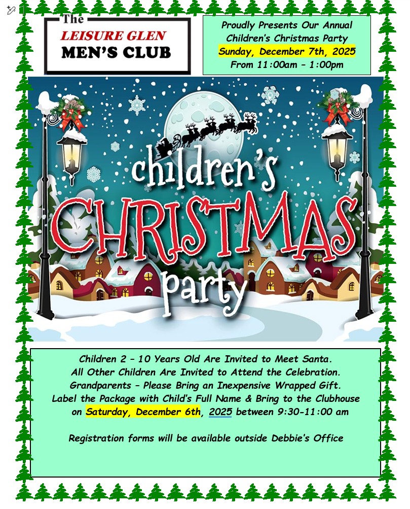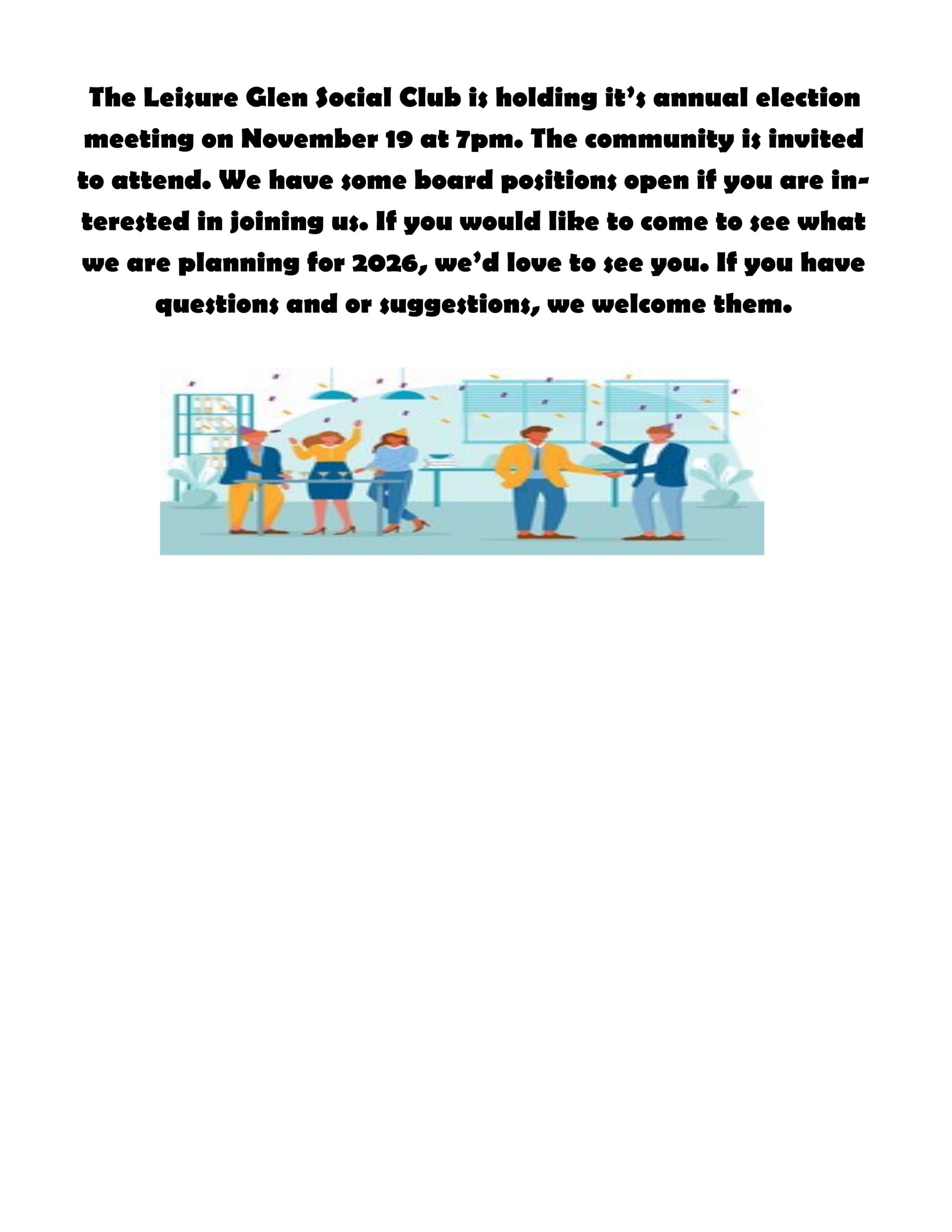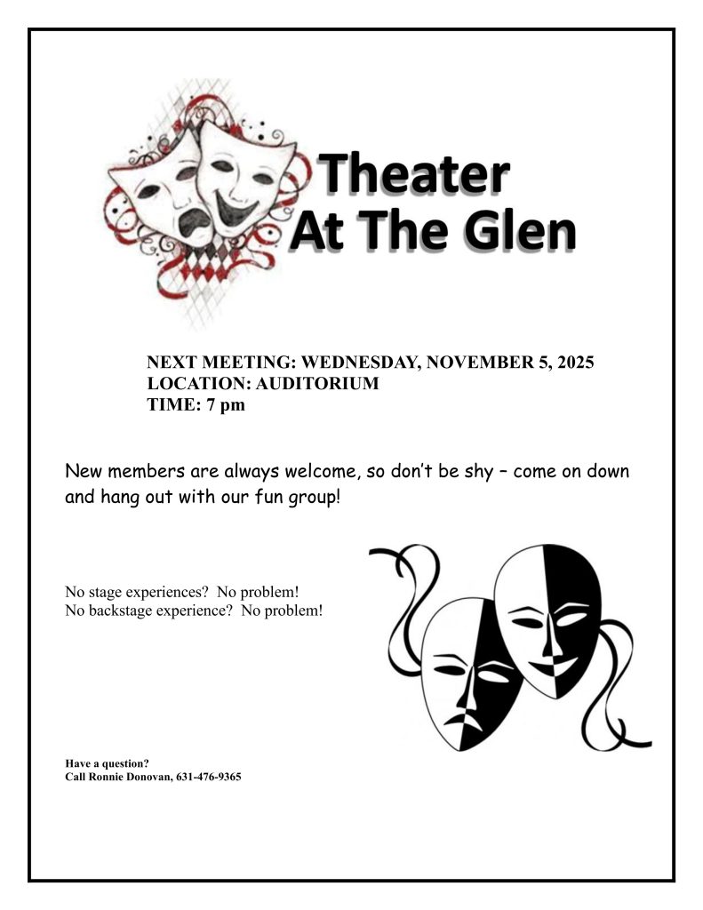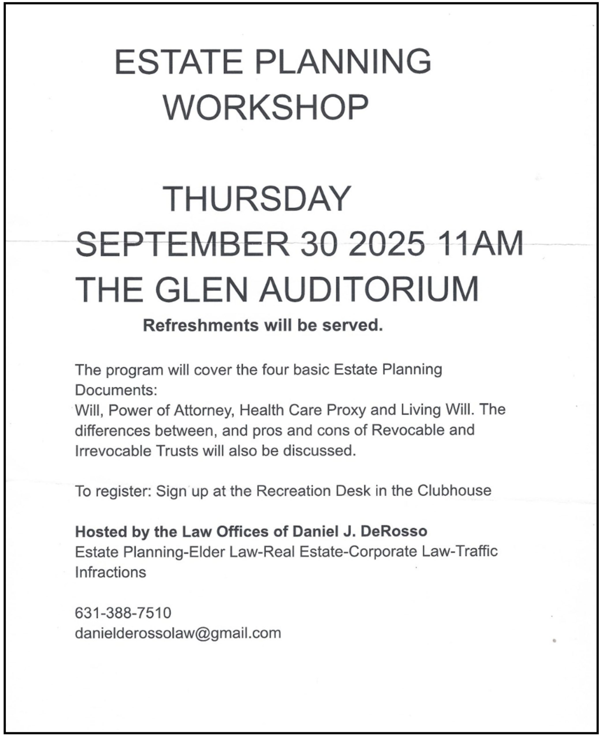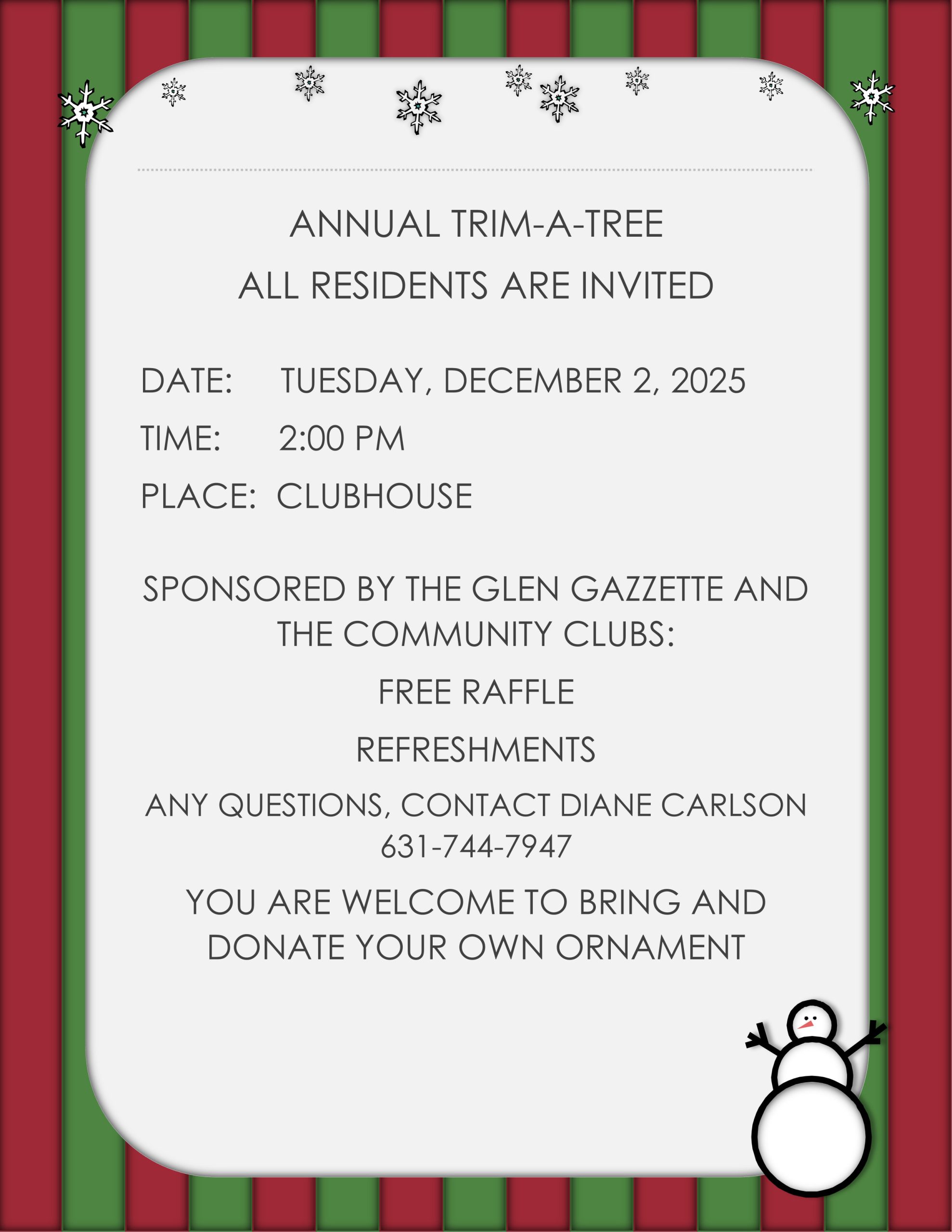 2026 Flyers New Years Eve Party 12/31 Social Club Holiday Party 12/18 Italian American Holiday Party 12/13 Garden Club Holiday Project 12/11 Holiday Giving Board Wrap Day 12/09 Children's Xmas Party 12/07 Trim-A-Tree 12/02 Holiday Tea 11/29 Holiday Toy Drive 11/24 - 12/15 Movie Night 11/21 Social Club Elections 11/19 Defensive Driving 11/12 Nite @ Races 11/08 Community Food Drive 11/06 Theater Club 11/05 Bagels, coffee Bake Sale 11/04 Halloween Party 10/31 Saving Money Ideas 10/29 Evening Movie 10/23 Columbus Day Dinner 10/18 Lawn Treatments 10/16-17 Garden Club 10/16 Theater Show 10/09, 10, 11, 12 Theater Boosters Estate Plan Workshop 9/30 Glen Cafe Oktoberfest 9/27 2025-2026 Budget Presentation 9/18 Italian American Club 9/12 Fall Fertilizer 9/11 Schmooze, Relax 9/10 September is Membership Month Pottery Class Signup 9/08 Outdoor Concert 8/29 First Friday 8/01 Legends 8/23 Movie Night "Plane" 8/22 Homeowners Insurance Presentation 8/07