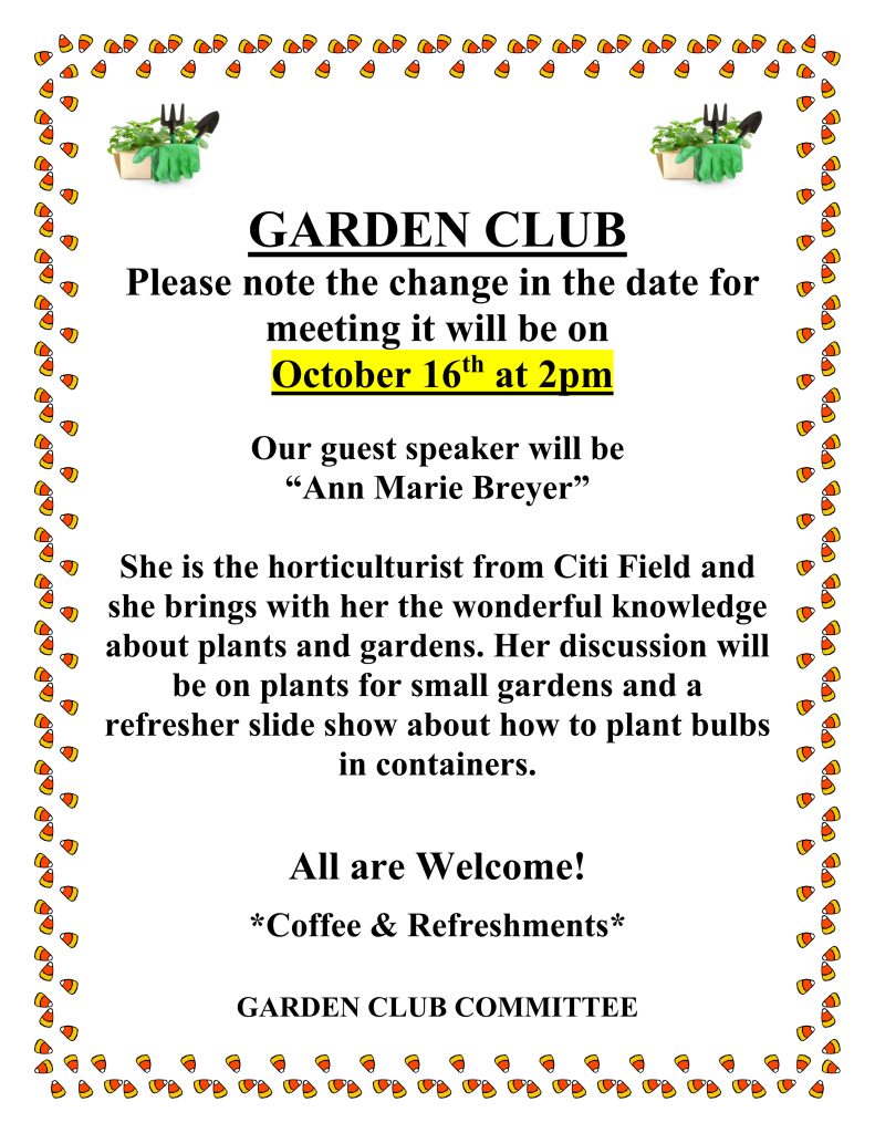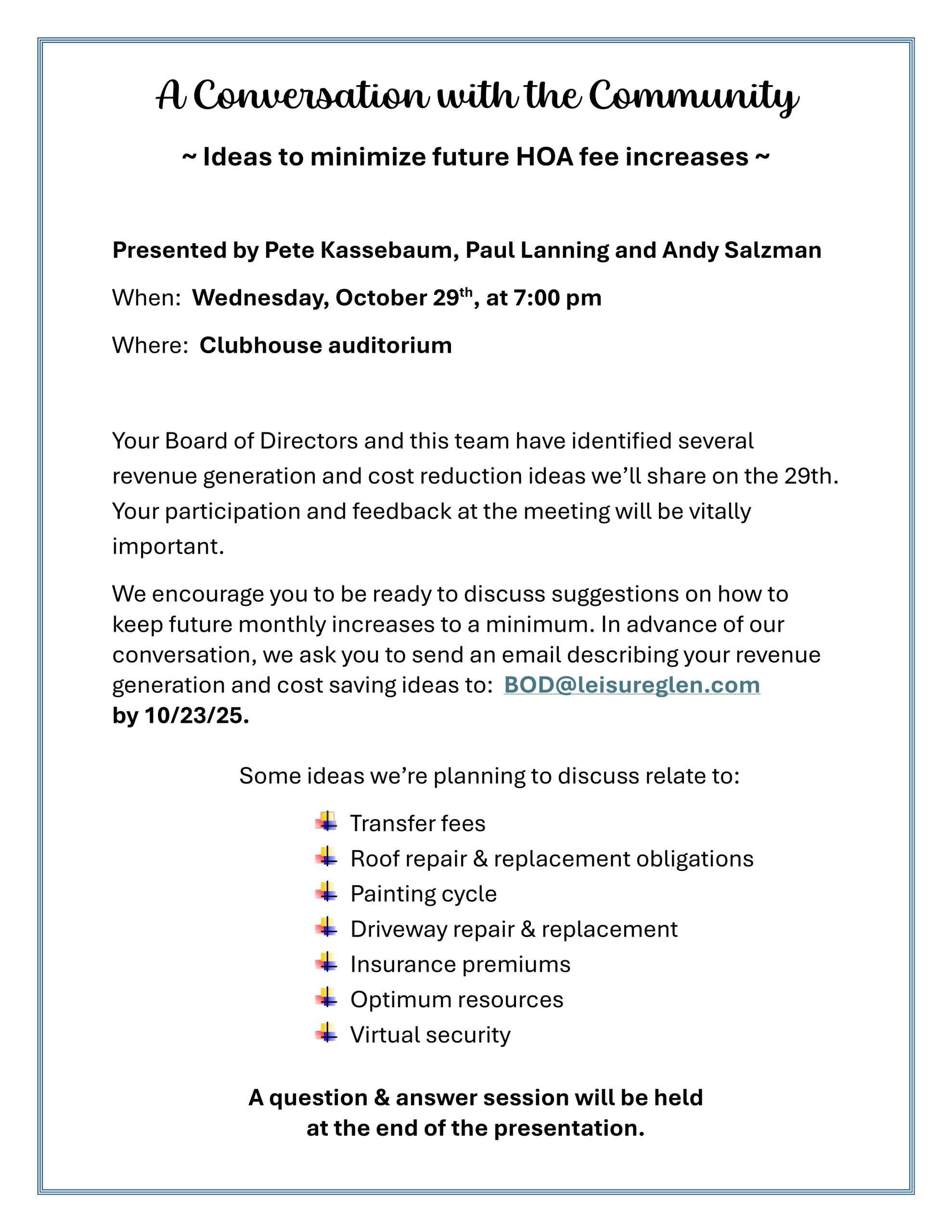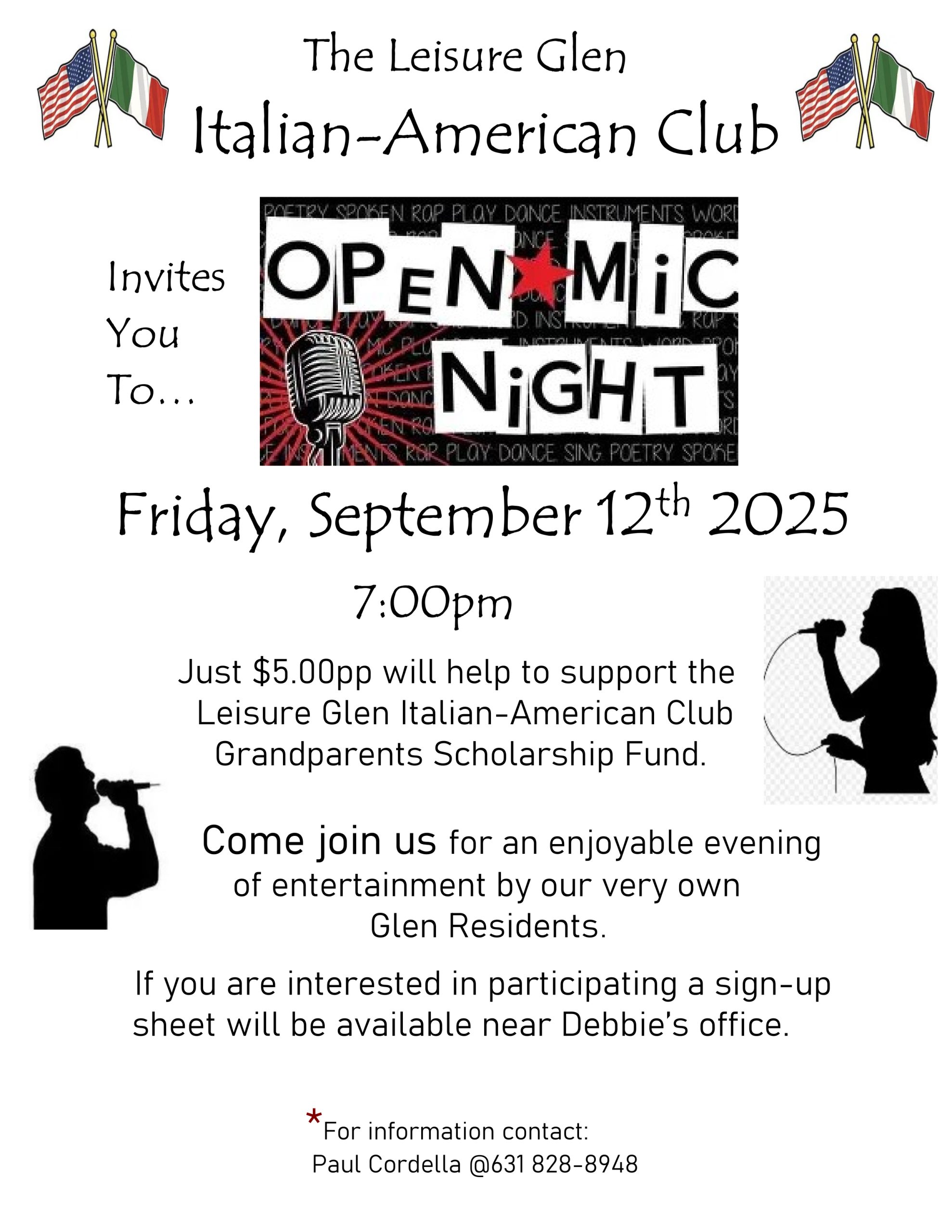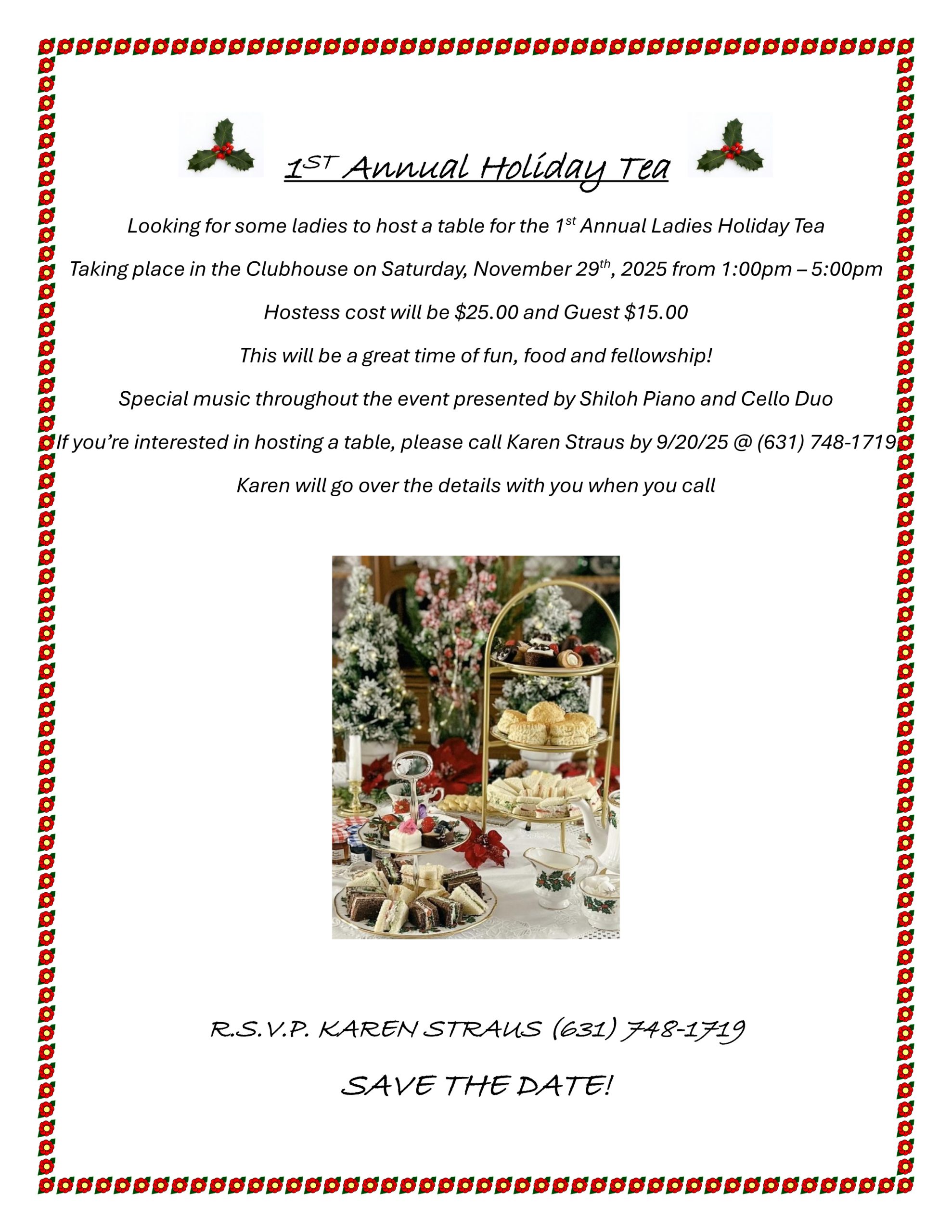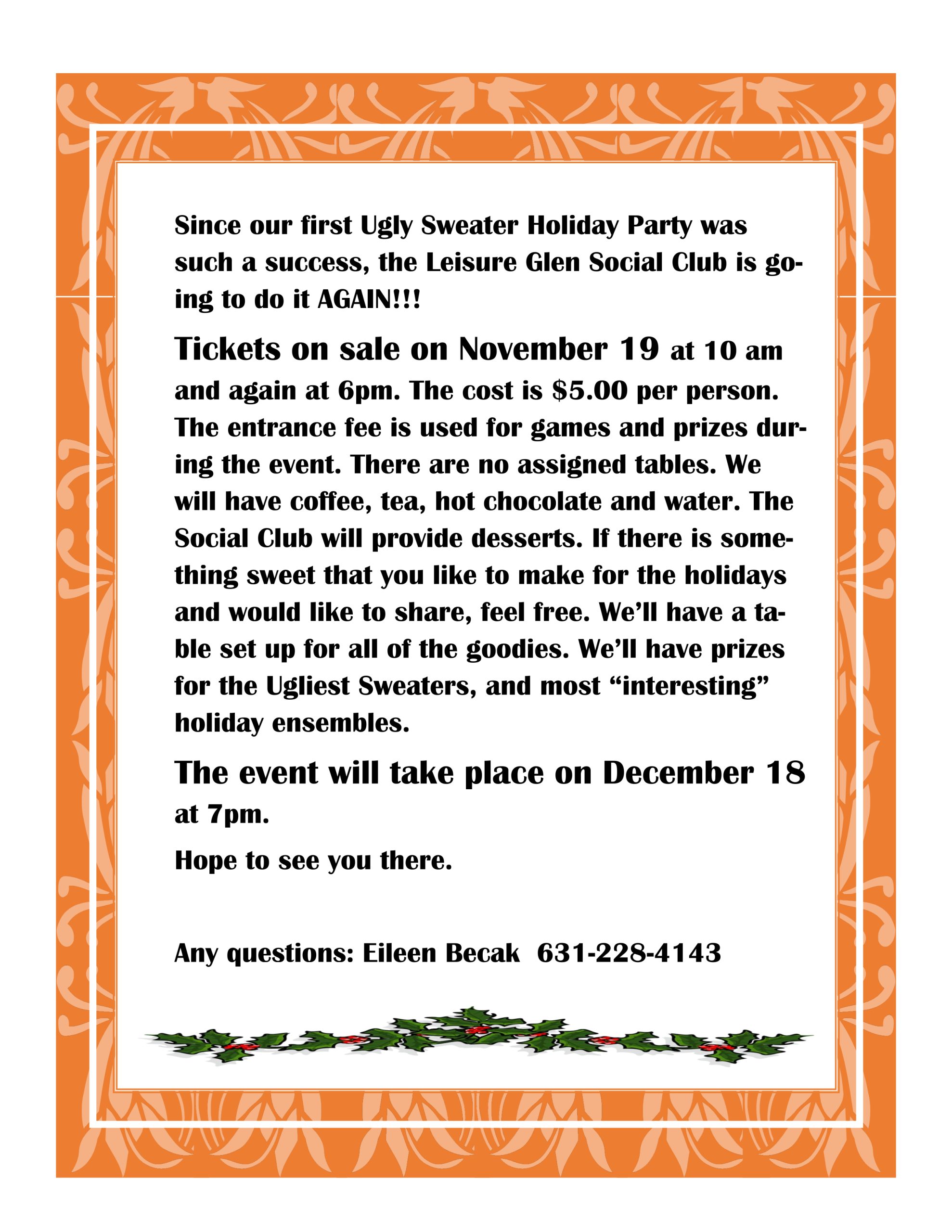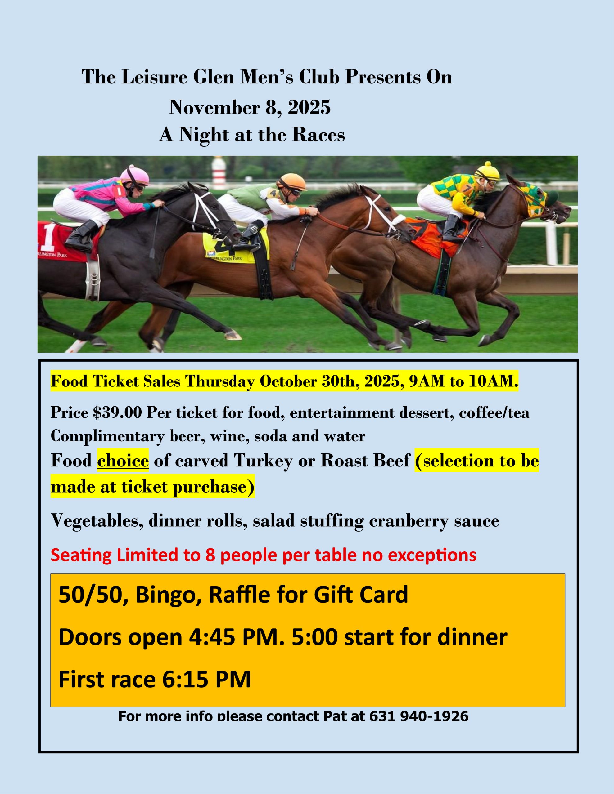 2026 Flyers New Years Eve Party 12/31 Social Club Holiday Party 12/18 Italian American Holiday Party 12/13 Garden Club Holiday Project 12/11 Holiday Giving Board Wrap Day 12/09 Children's Xmas Party 12/07 Trim-A-Tree 12/02 Holiday Tea 11/29 Holiday Toy Drive 11/24 - 12/15 Movie Night 11/21 Social Club Elections 11/19 Defensive Driving 11/12 Nite @ Races 11/08 Community Food Drive 11/06 Theater Club 11/05 Bagels, coffee Bake Sale 11/04 Halloween Party 10/31 Saving Money Ideas 10/29 Evening Movie 10/23 Columbus Day Dinner 10/18 Lawn Treatments 10/16-17 Garden Club 10/16 Theater Show 10/09, 10, 11, 12 Theater Boosters Estate Plan Workshop 9/30 Glen Cafe Oktoberfest 9/27 2025-2026 Budget Presentation 9/18 Italian American Club 9/12 Fall Fertilizer 9/11 Schmooze, Relax 9/10 September is Membership Month Pottery Class Signup 9/08 Outdoor Concert 8/29 First Friday 8/01 Legends 8/23 Movie Night "Plane" 8/22 Homeowners Insurance Presentation 8/07