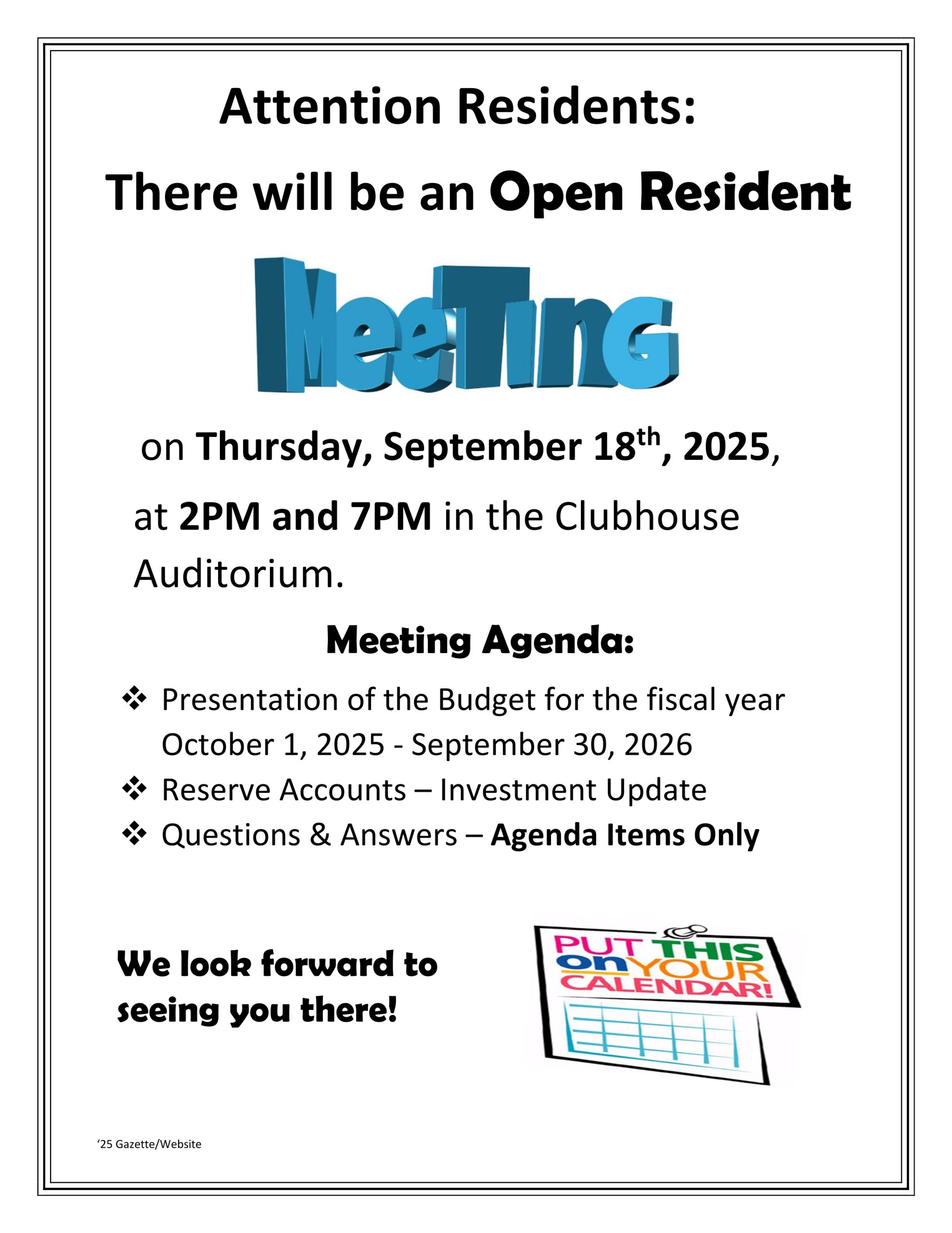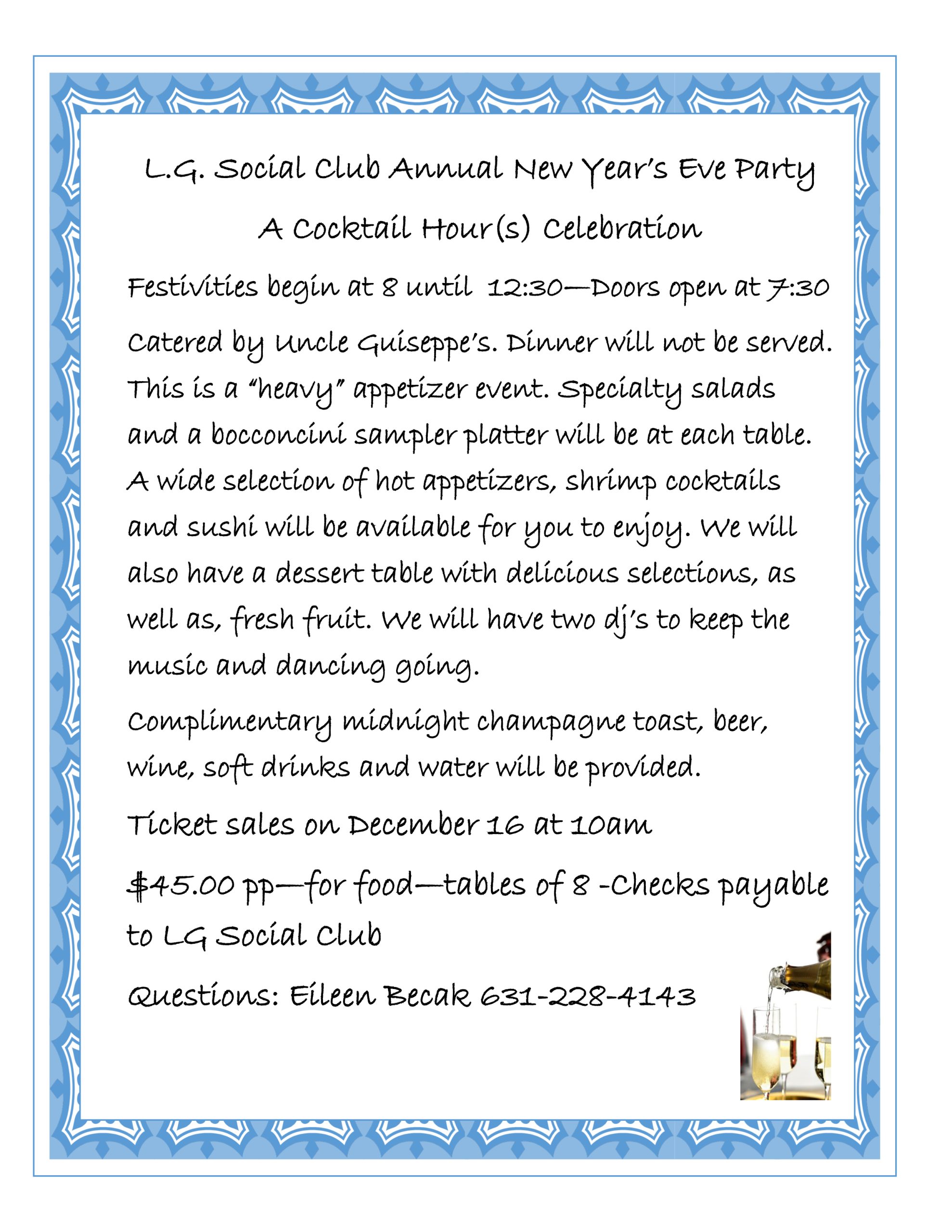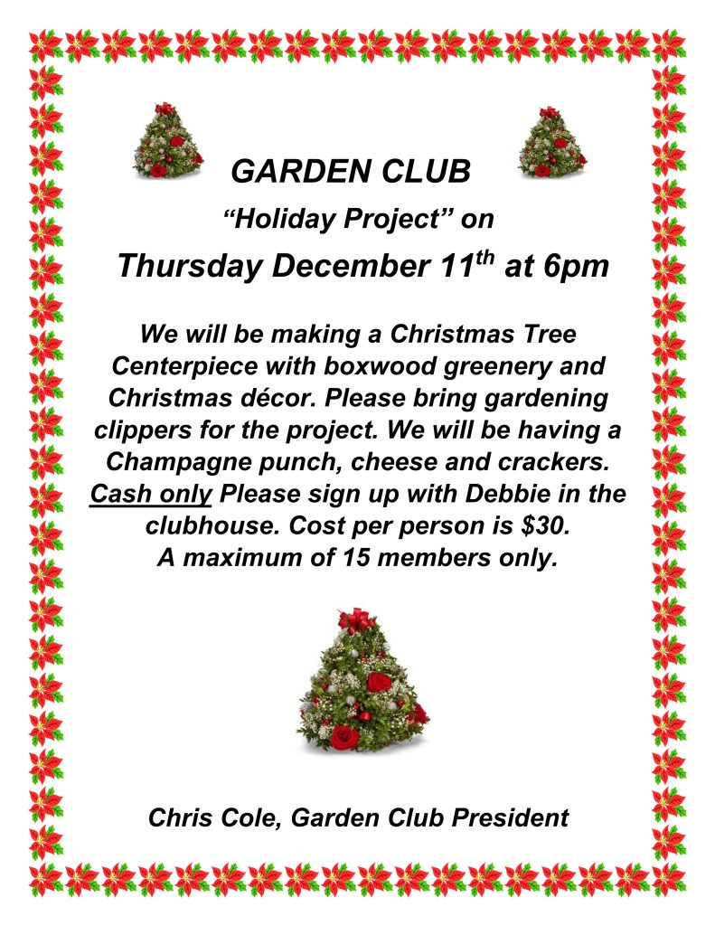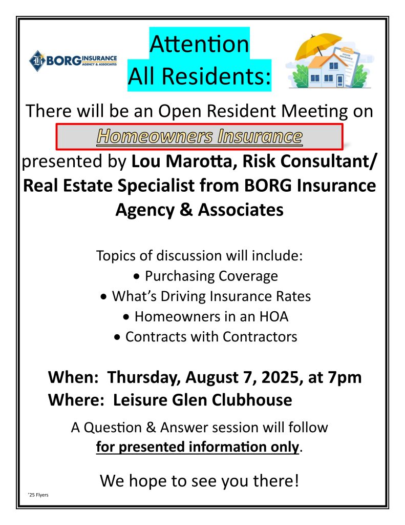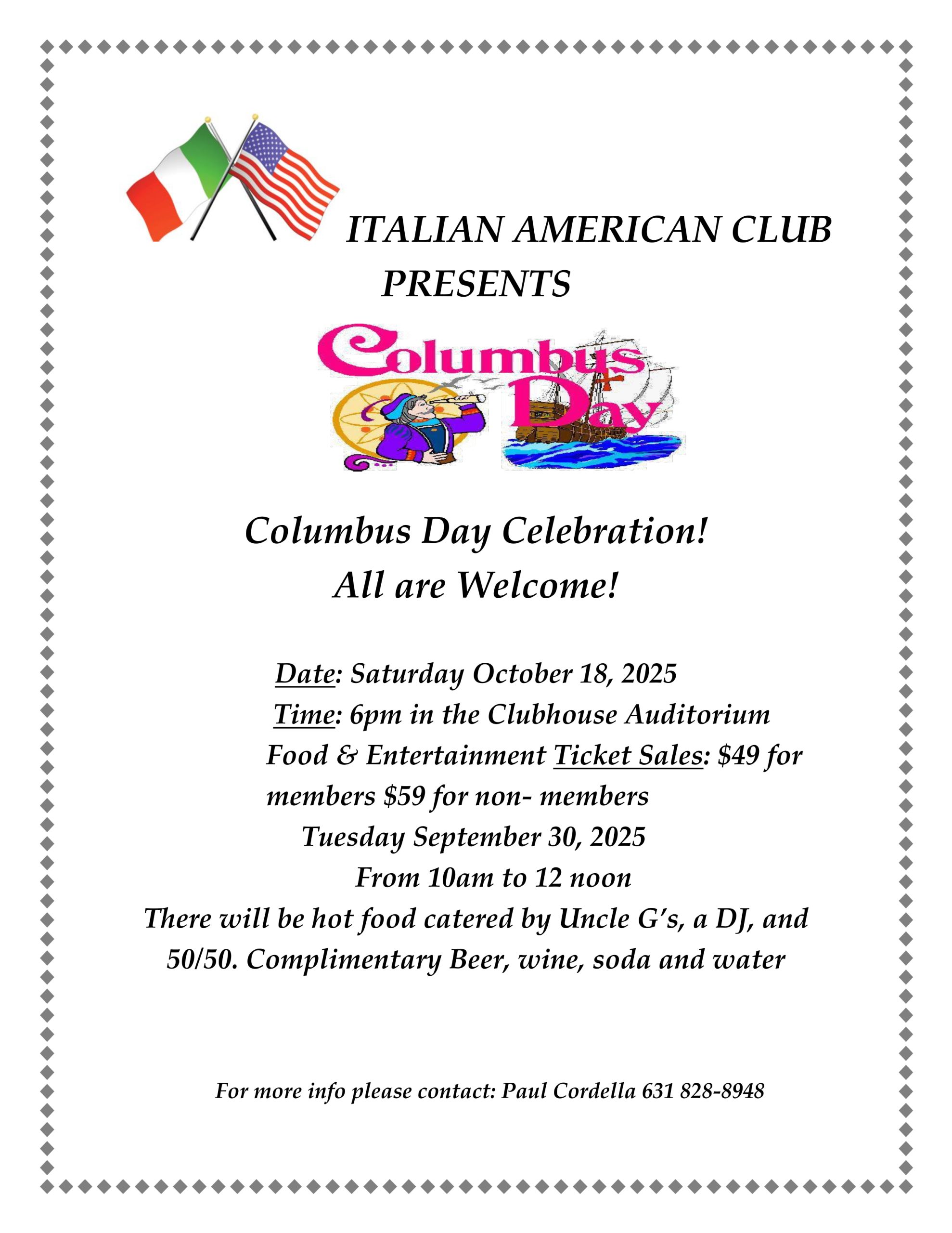 2026 Flyers New Years Eve Party 12/31 Social Club Holiday Party 12/18 Italian American Holiday Party 12/13 Garden Club Holiday Project 12/11 Holiday Giving Board Wrap Day 12/09 Children's Xmas Party 12/07 Trim-A-Tree 12/02 Holiday Tea 11/29 Holiday Toy Drive 11/24 - 12/15 Movie Night 11/21 Social Club Elections 11/19 Defensive Driving 11/12 Nite @ Races 11/08 Community Food Drive 11/06 Theater Club 11/05 Bagels, coffee Bake Sale 11/04 Halloween Party 10/31 Saving Money Ideas 10/29 Evening Movie 10/23 Columbus Day Dinner 10/18 Lawn Treatments 10/16-17 Garden Club 10/16 Theater Show 10/09, 10, 11, 12 Theater Boosters Estate Plan Workshop 9/30 Glen Cafe Oktoberfest 9/27 2025-2026 Budget Presentation 9/18 Italian American Club 9/12 Fall Fertilizer 9/11 Schmooze, Relax 9/10 September is Membership Month Pottery Class Signup 9/08 Outdoor Concert 8/29 First Friday 8/01 Legends 8/23 Movie Night "Plane" 8/22 Homeowners Insurance Presentation 8/07